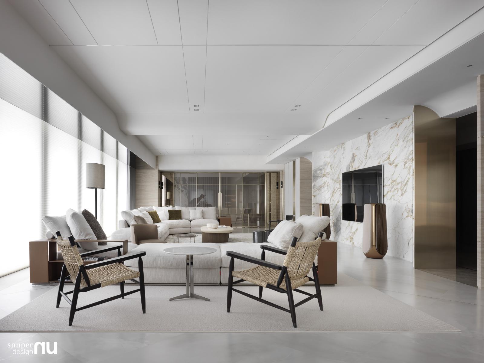 溫潤木質主調,搭配淺米、霧白與柔和灰階,形成低對比、耐久觀看的基底。牆面與櫃體多以木皮與細緻織紋材質鋪陳,線條簡潔,比例克制,使空間在大尺度中仍保有安定感。公共空間選用弧形布織沙發、低背家具與圓潤桌几,降低視覺重量,讓動線與視野保持通透。白色平台鋼琴成為空間中的藝術物件,與柔軟家具形成材質對比,營造介於居住與收藏之間的生活場景。私領域延續溫和色系與自然材質,衣櫃與收納系統以木質結構與內嵌照明呈現,兼顧機能與質感。整體風格不追求張揚,而是以細節與比例,塑造適合長時間居住的高端住宅氛圍。