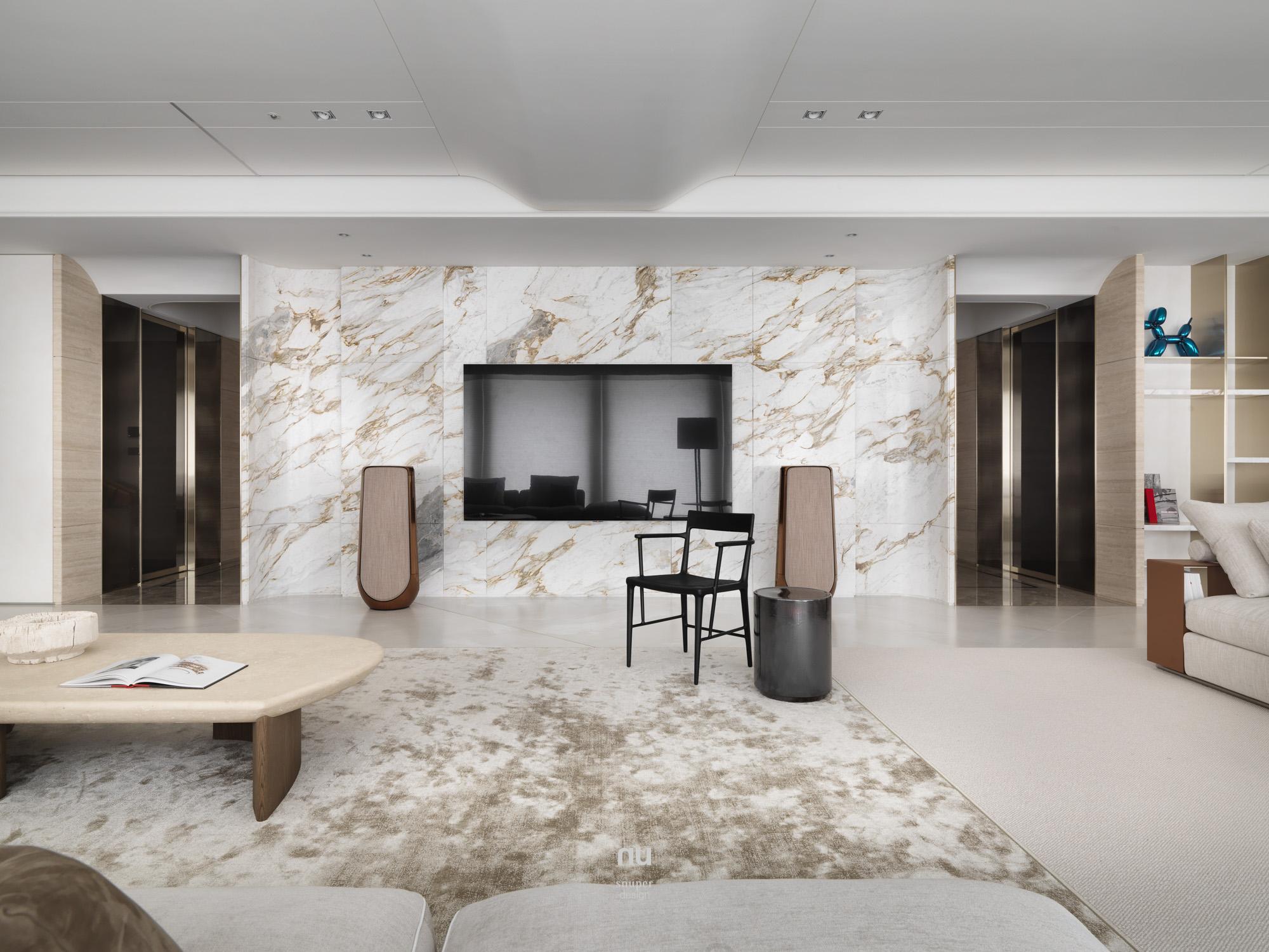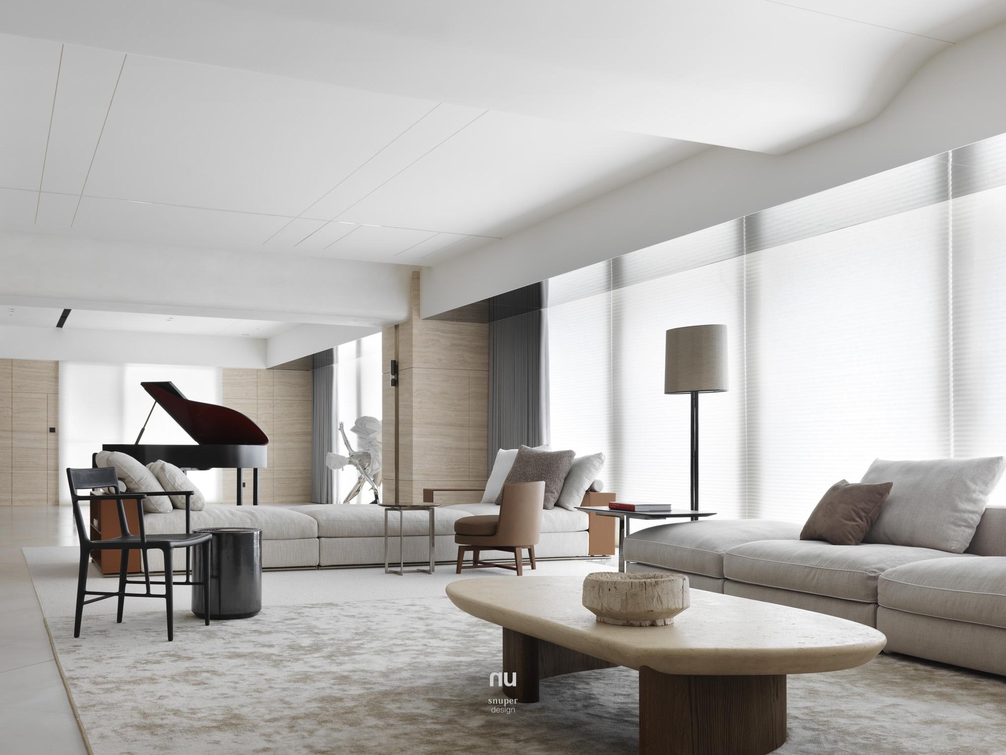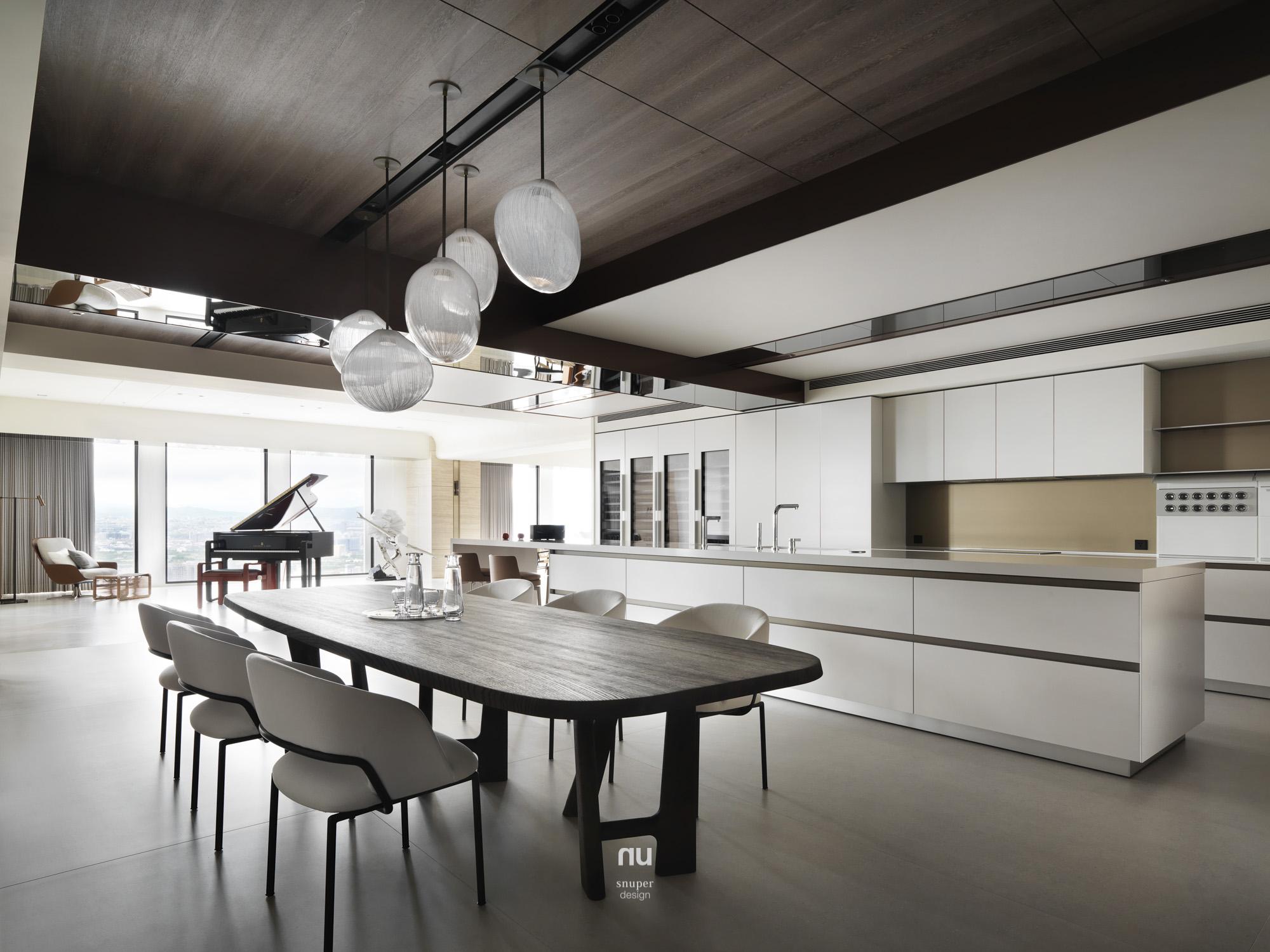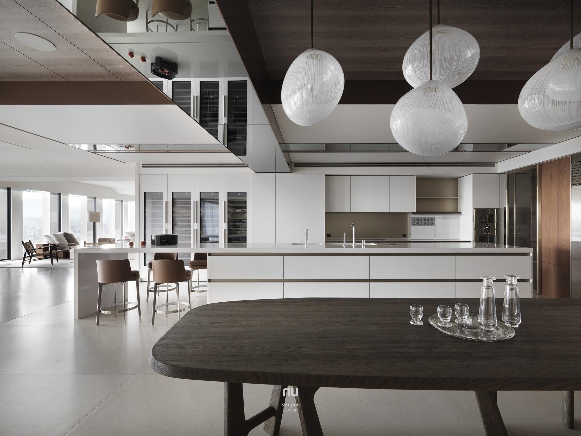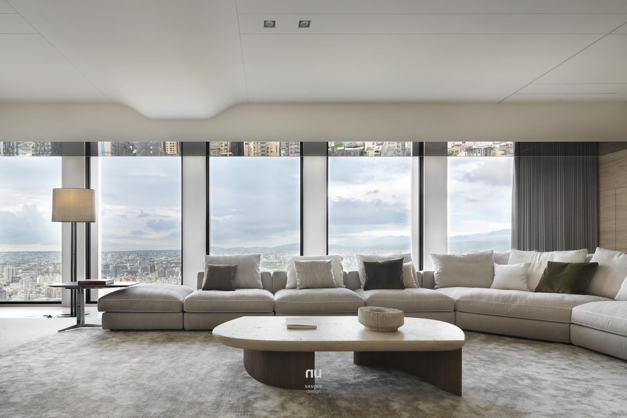 頂層之上,設計不再追求被看見,而是被感受。以高度、留白與材質密度構築秩序,石材與木質在不同場域中調整份量與溫度,讓客廳的開闊、餐廚的凝聚與衛浴的沉靜,各自成立、彼此呼應。在城市之巔,形成一種安靜、經得起時間的居住狀態。