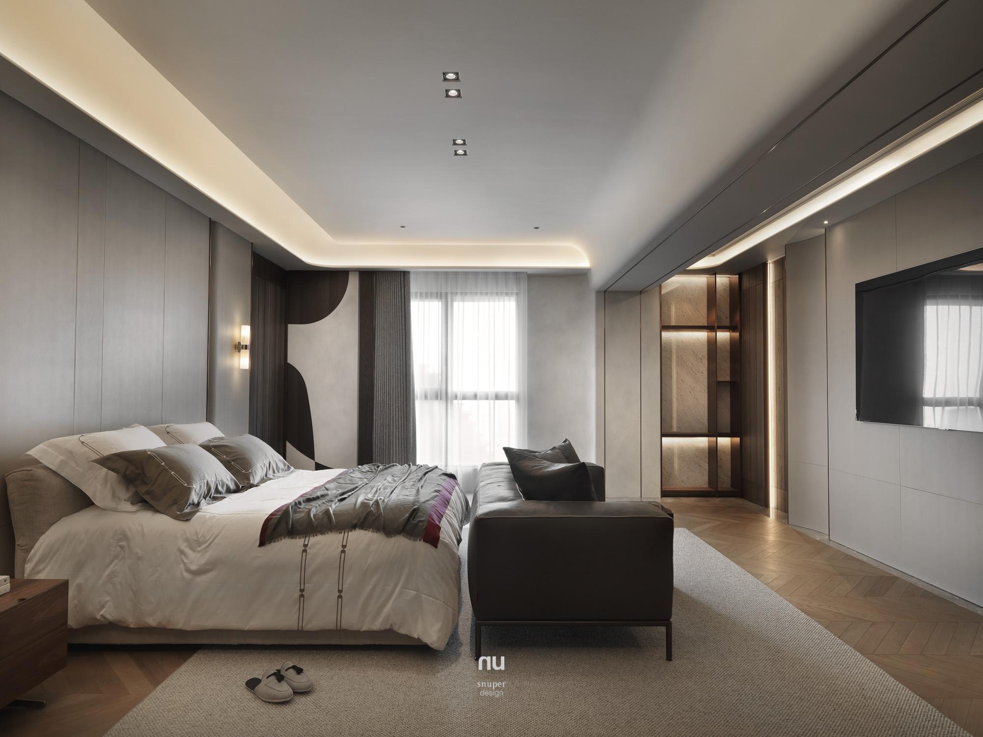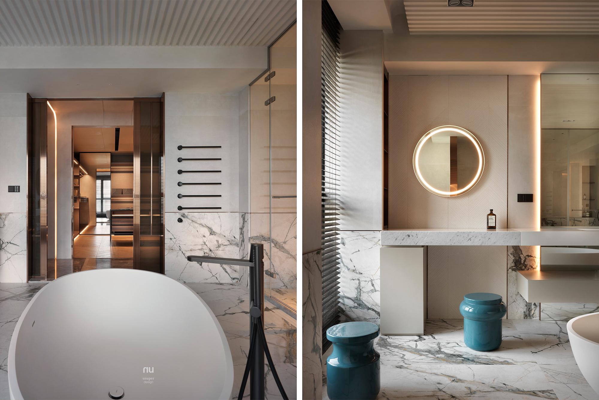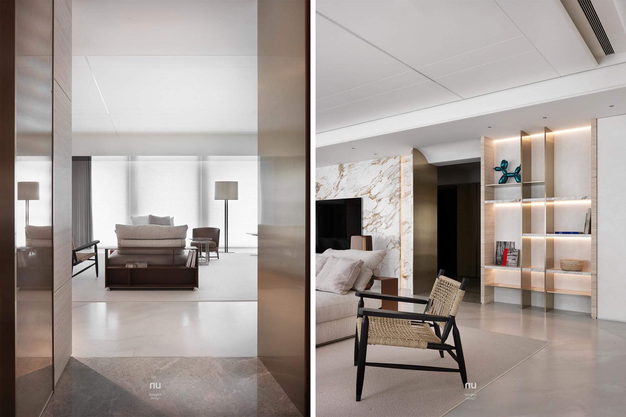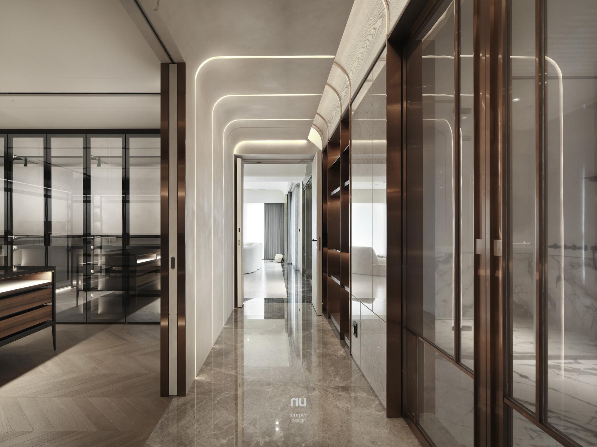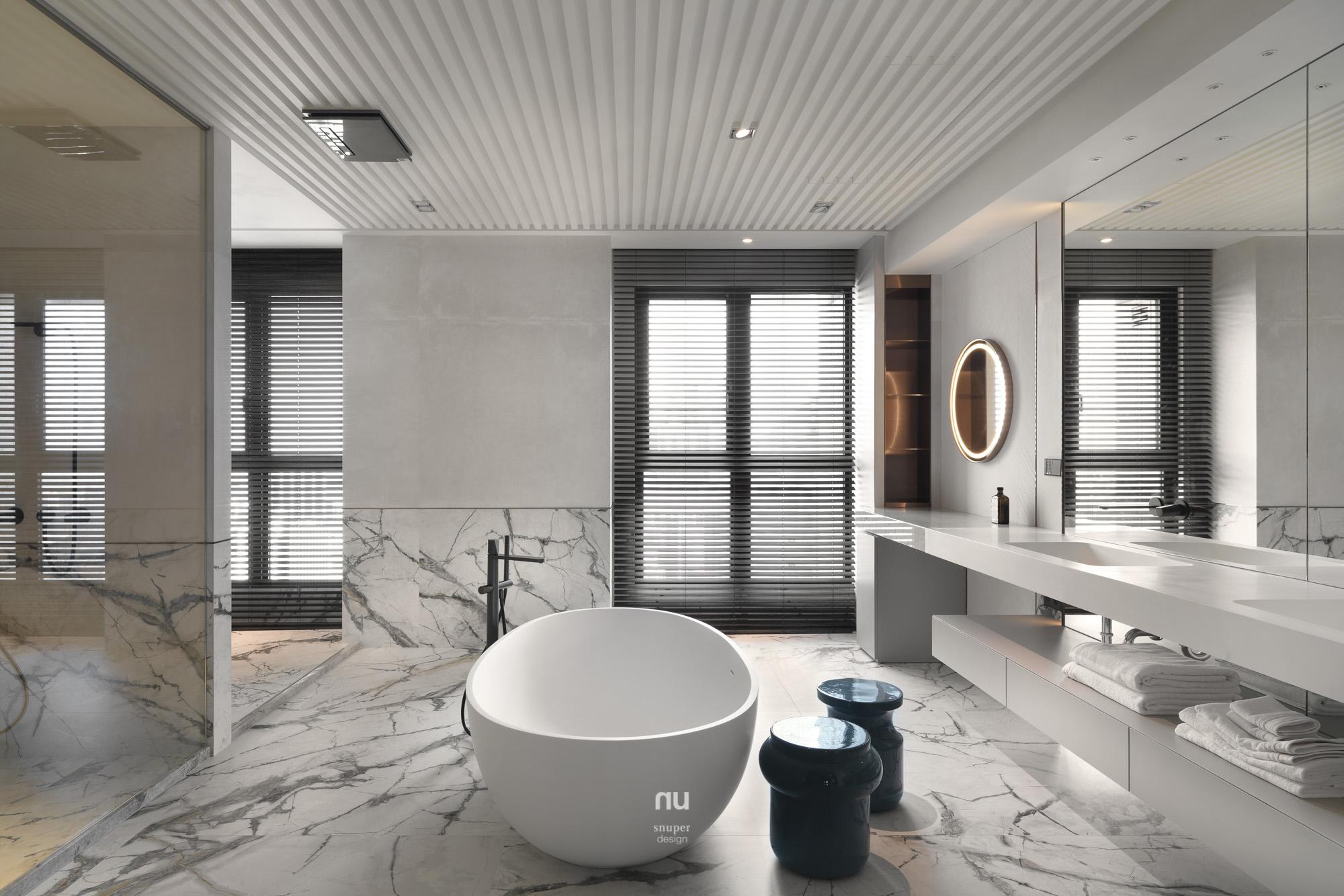 頂層之上,設計不再追求被看見,而是被感受。以高度、留白與材質密度構築秩序,石材與木質在不同場域中調整份量與溫度,讓客廳的開闊、餐廚的凝聚與衛浴的沉靜,各自成立、彼此呼應。在城市之巔,形成一種安靜、經得起時間的居住狀態。