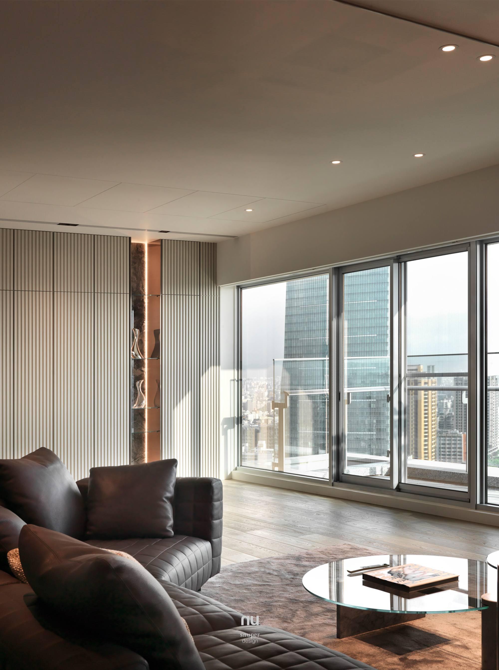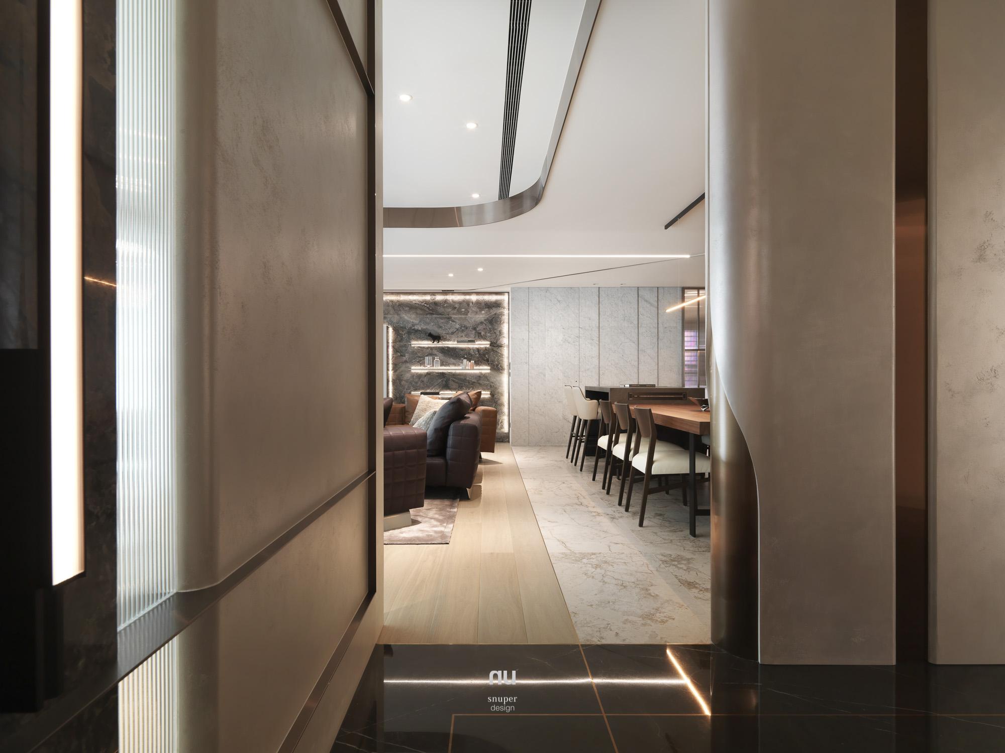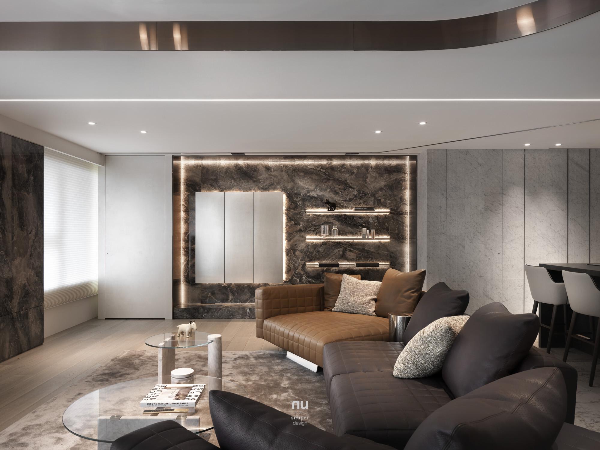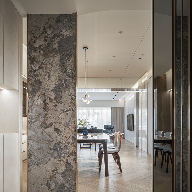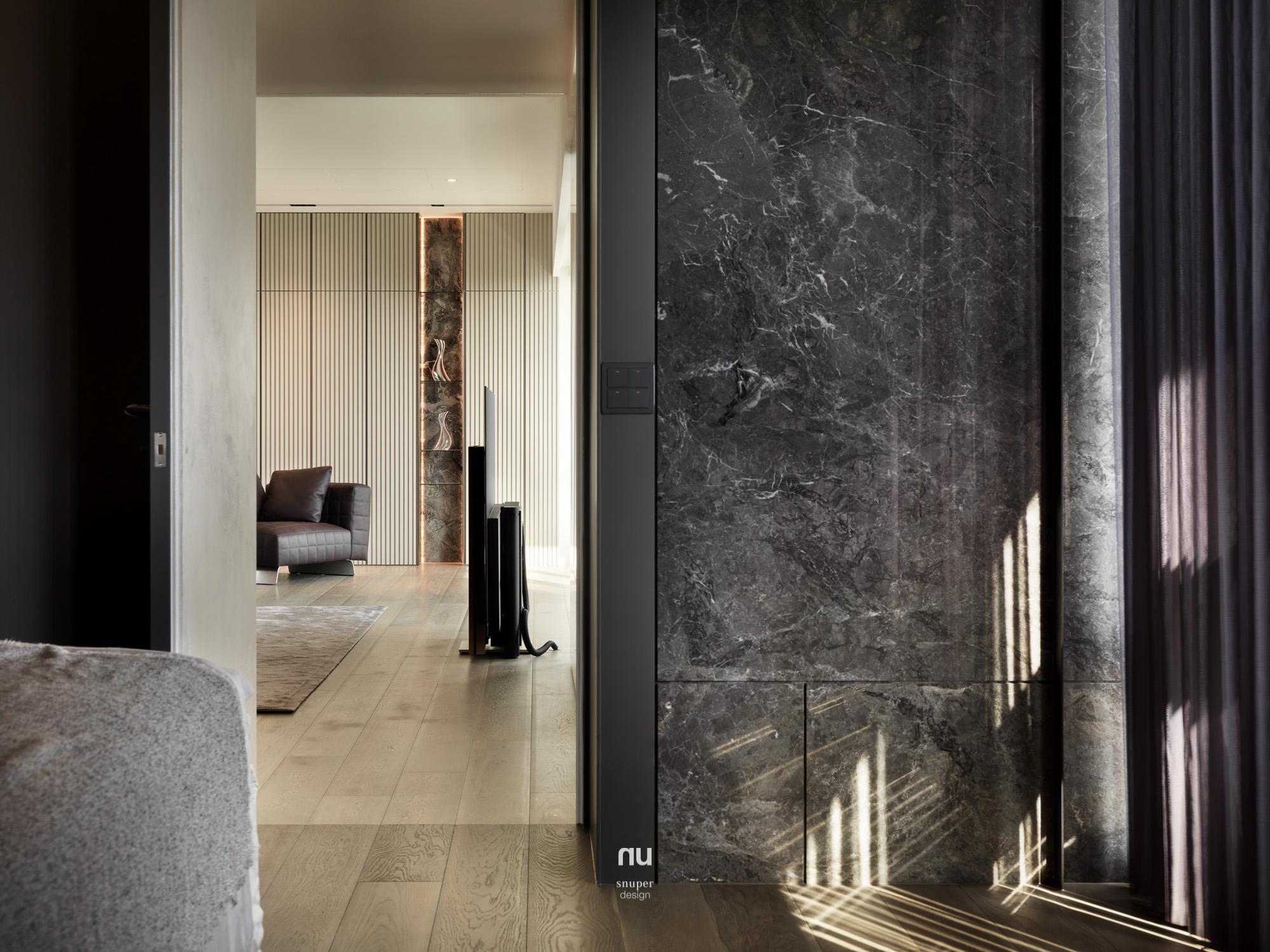 地坪以溫潤木質鋪陳公共區域基調,搭配大面石材牆與局部深色端景,形塑沉穩而內斂的空間層次;入口與轉折區則以高亮石材地坪界定迎賓儀式。立面透過格柵、線性語彙與金屬收邊統整視覺秩序,霧面牆質讓光線停留其上,低調而克制。客廳以深色石材主牆結合背光層次,銜接窗外城市輪廓與遠山景致,使景觀成為日常視野的一部分。動線由玄關的「由石入木」材質轉換展開,並以半透材質與圓角細節柔化公私邊界;衛浴與更衣空間則以整面石材、線性燈帶與鏡面整合,回應生活所需的機能與秩序。