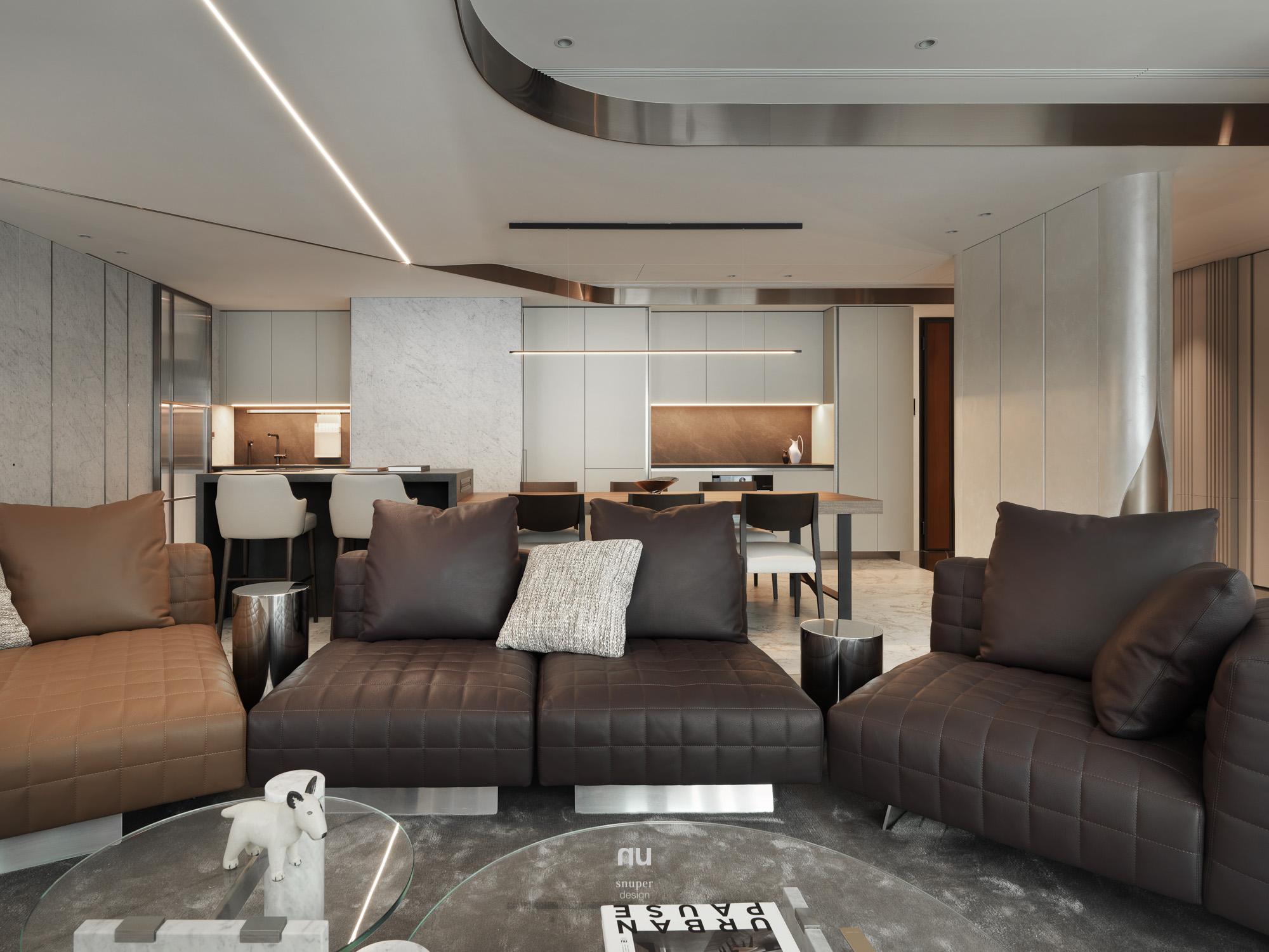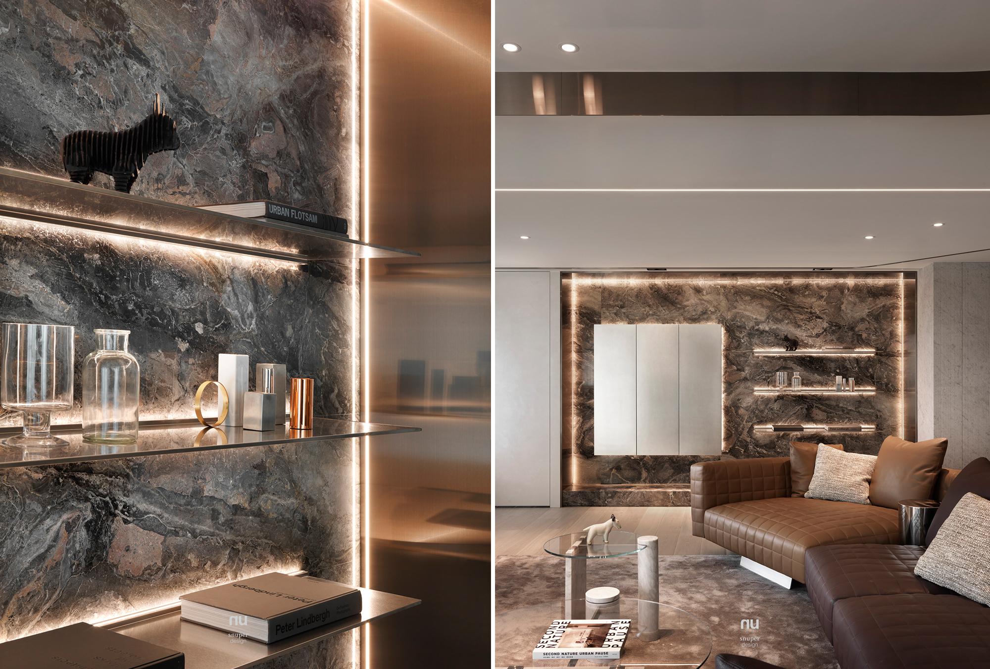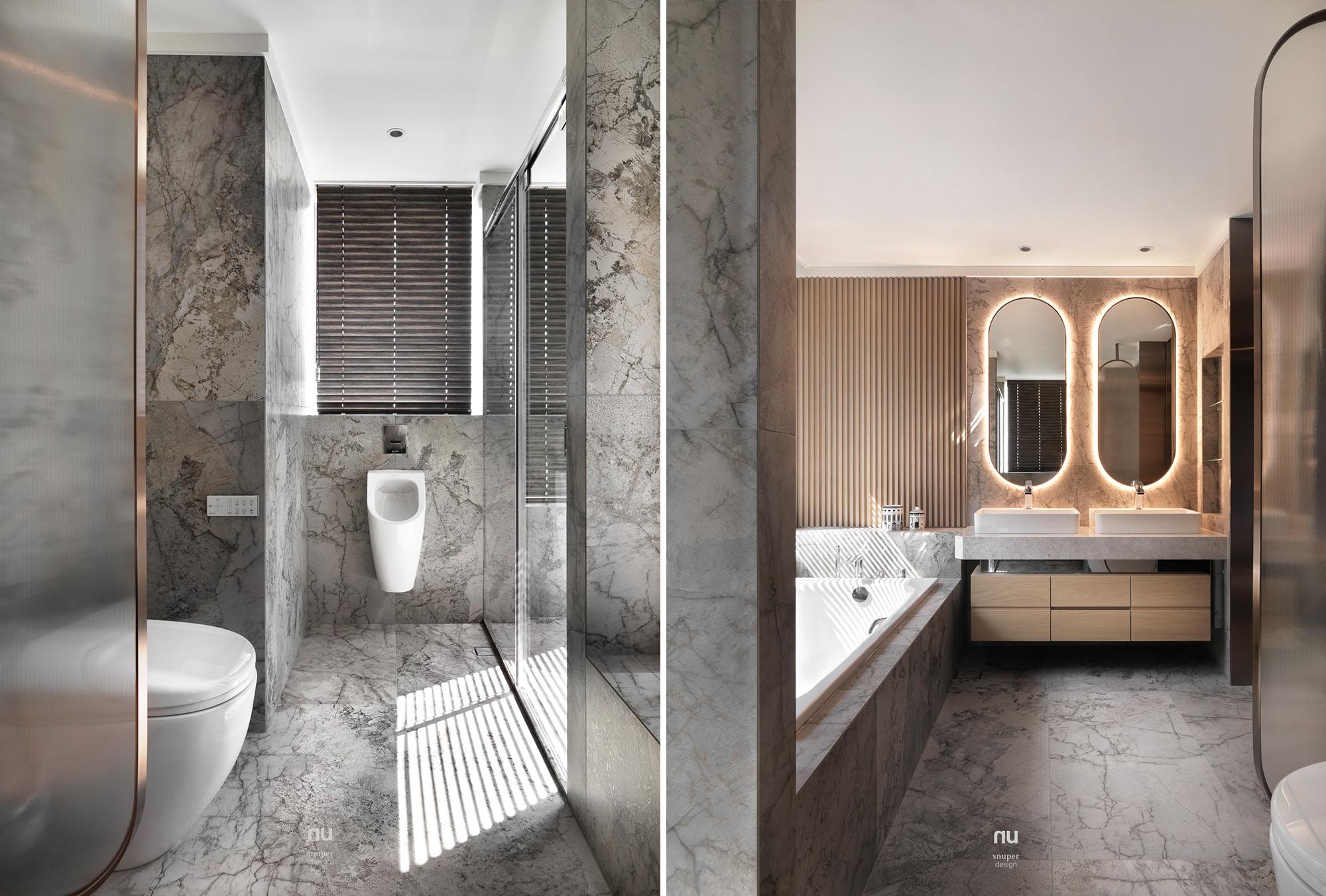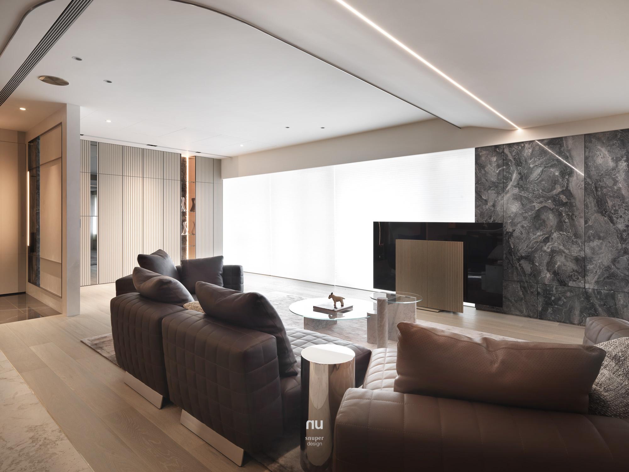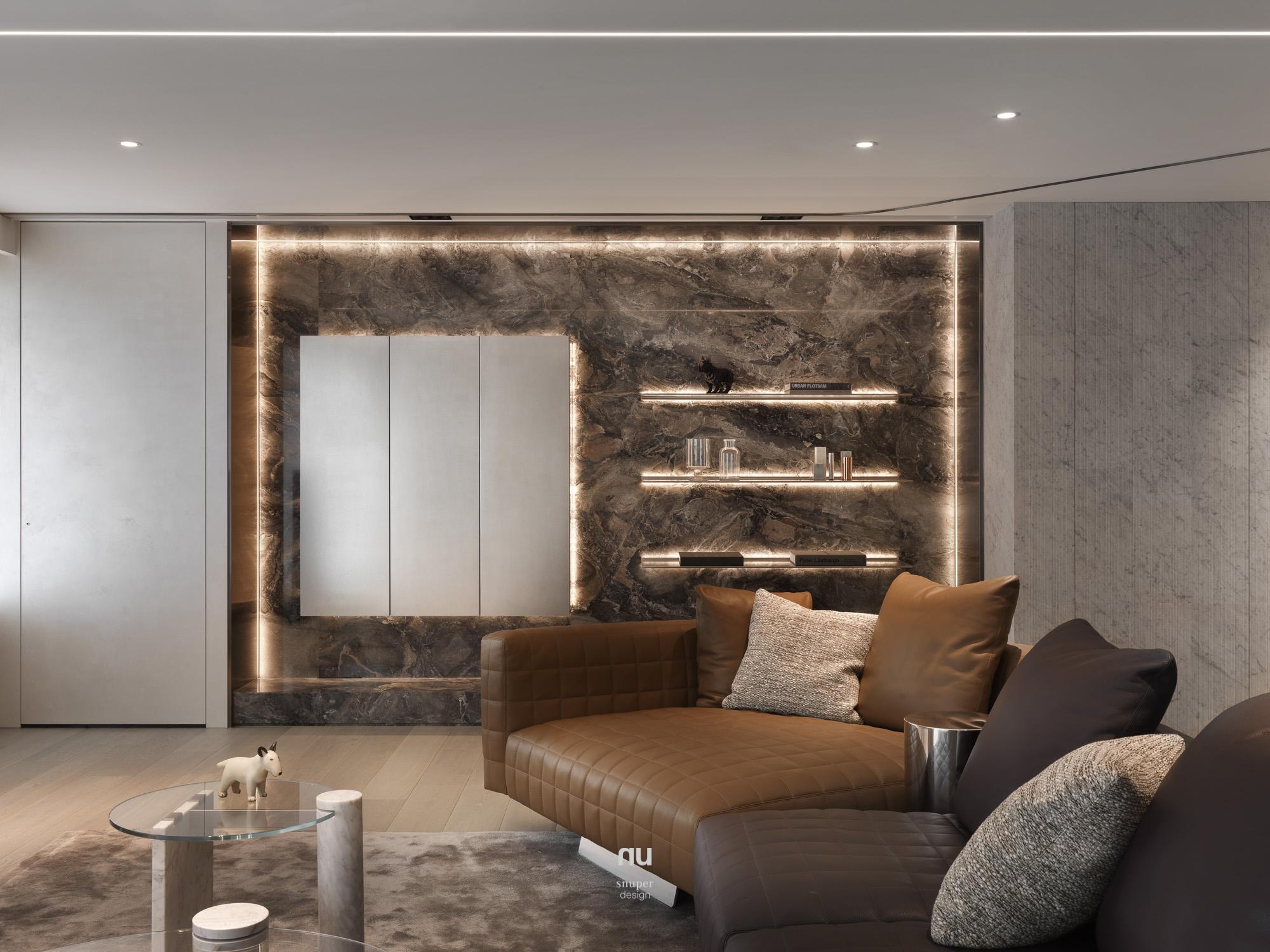 地坪以溫潤木質鋪陳公共區域基調,搭配大面石材牆與局部深色端景,形塑沉穩而內斂的空間層次;入口與轉折區則以高亮石材地坪界定迎賓儀式。立面透過格柵、線性語彙與金屬收邊統整視覺秩序,霧面牆質讓光線停留其上,低調而克制。客廳以深色石材主牆結合背光層次,銜接窗外城市輪廓與遠山景致,使景觀成為日常視野的一部分。動線由玄關的「由石入木」材質轉換展開,並以半透材質與圓角細節柔化公私邊界;衛浴與更衣空間則以整面石材、線性燈帶與鏡面整合,回應生活所需的機能與秩序。