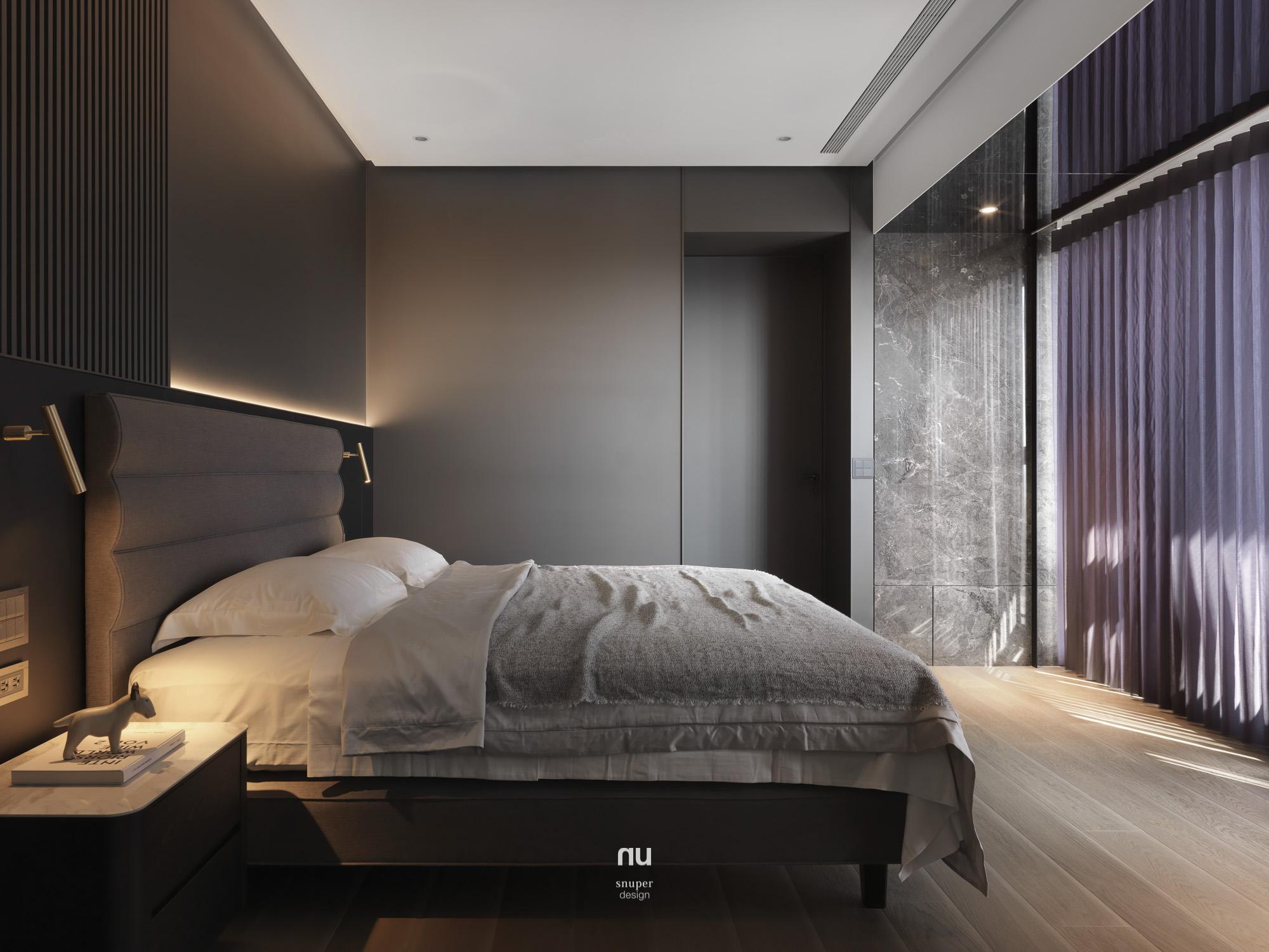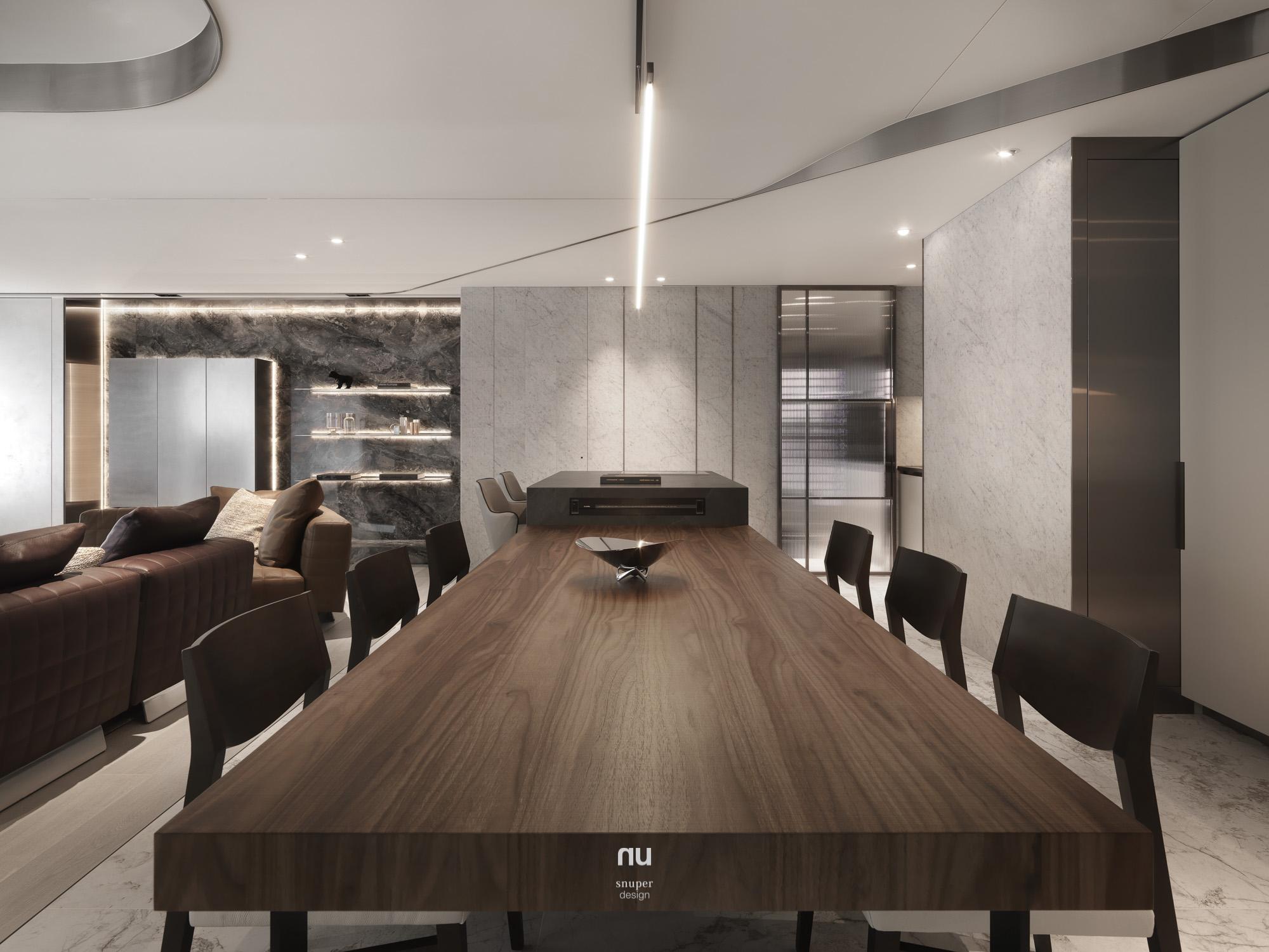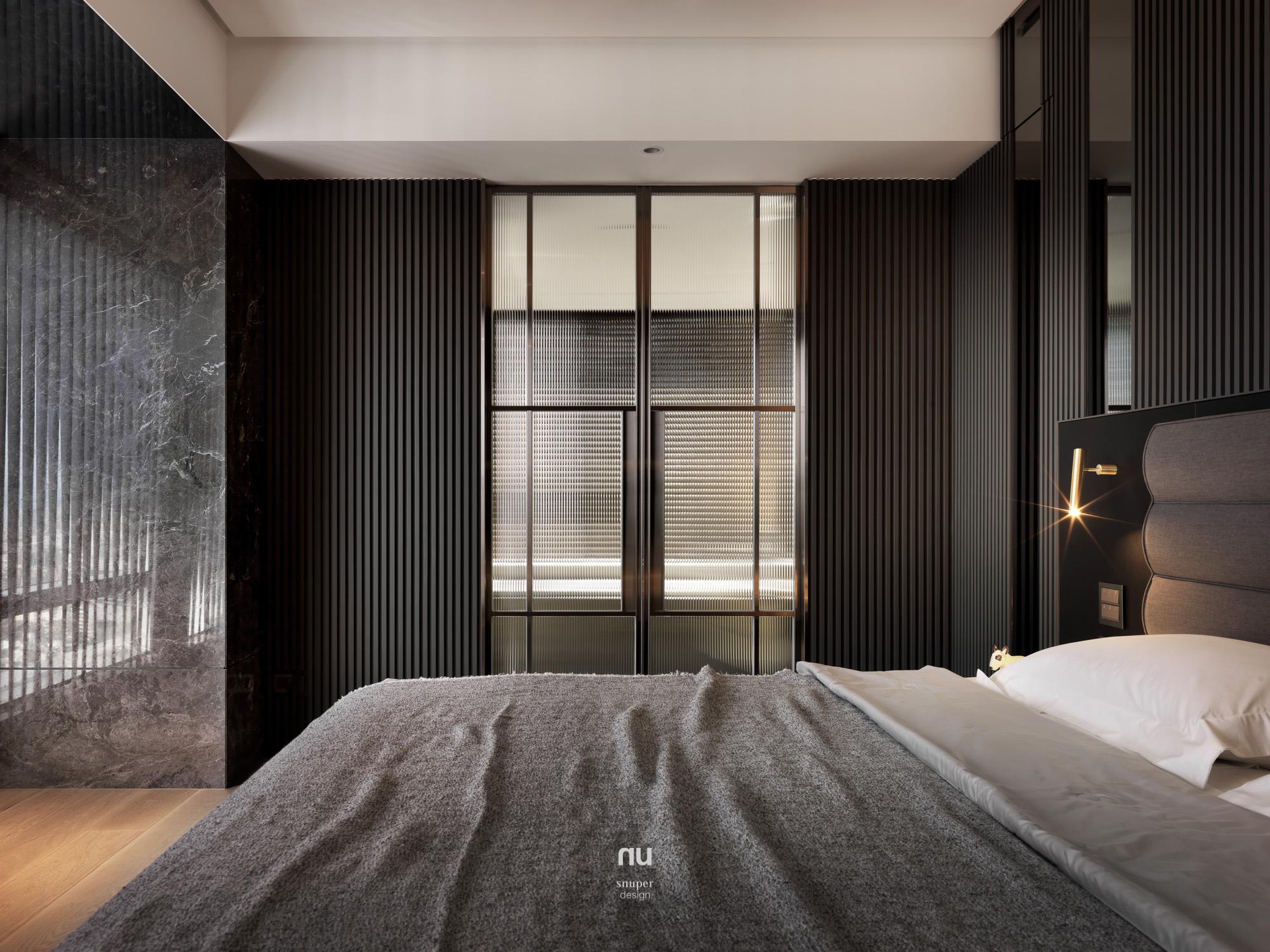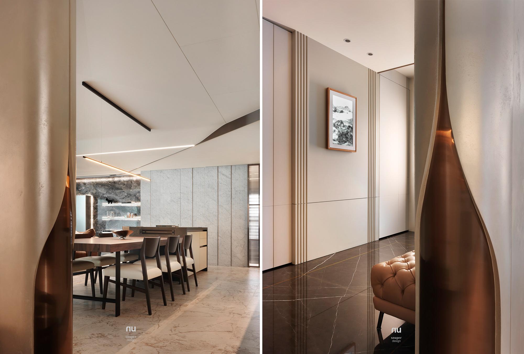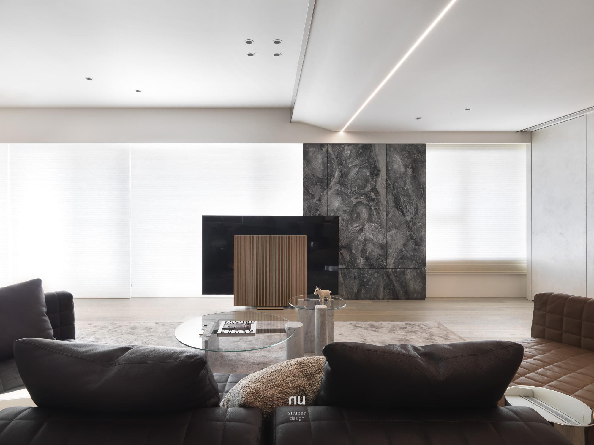 地坪以溫潤木質鋪陳公共區域基調,搭配大面石材牆與局部深色端景,形塑沉穩而內斂的空間層次;入口與轉折區則以高亮石材地坪界定迎賓儀式。立面透過格柵、線性語彙與金屬收邊統整視覺秩序,霧面牆質讓光線停留其上,低調而克制。客廳以深色石材主牆結合背光層次,銜接窗外城市輪廓與遠山景致,使景觀成為日常視野的一部分。動線由玄關的「由石入木」材質轉換展開,並以半透材質與圓角細節柔化公私邊界;衛浴與更衣空間則以整面石材、線性燈帶與鏡面整合,回應生活所需的機能與秩序。
