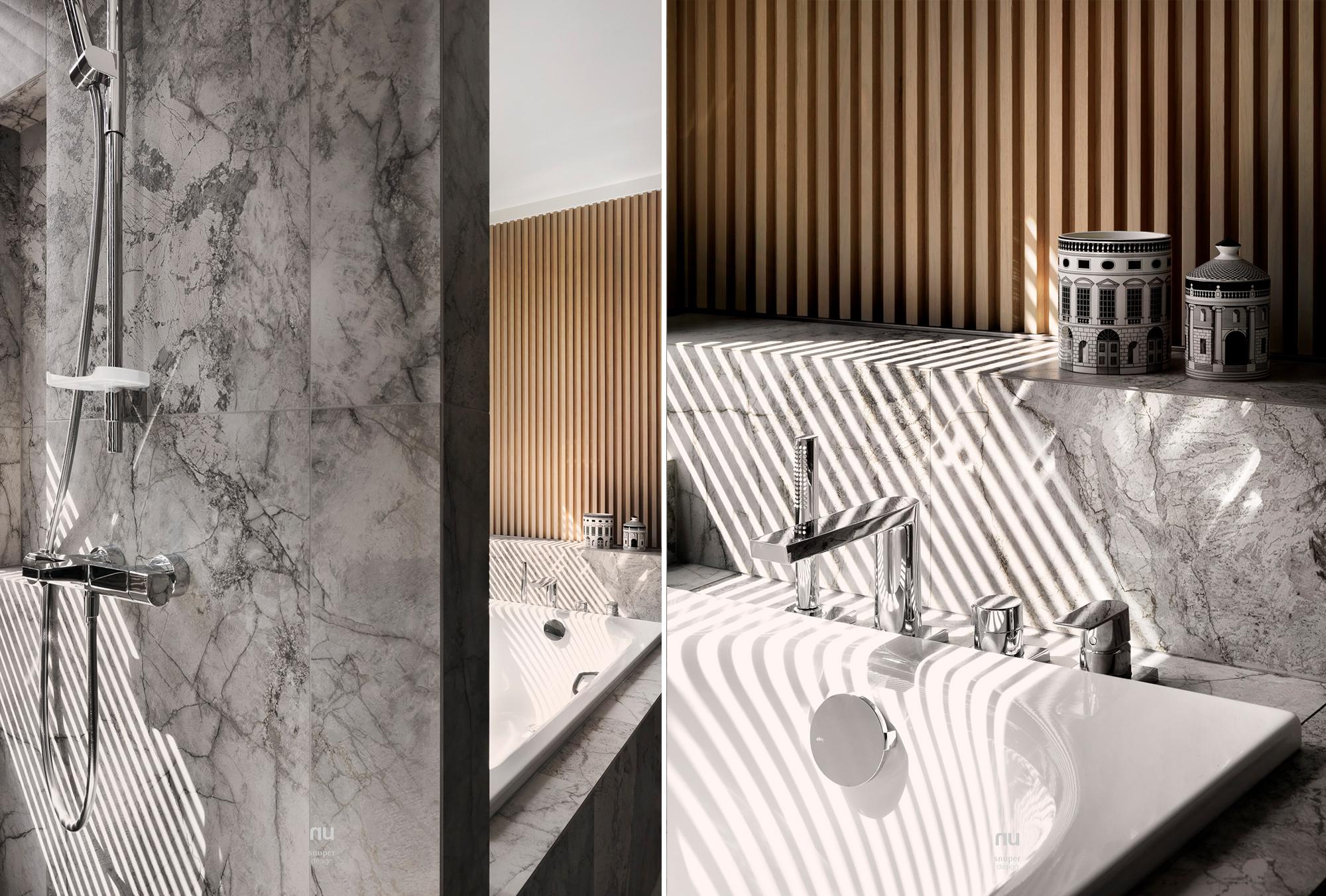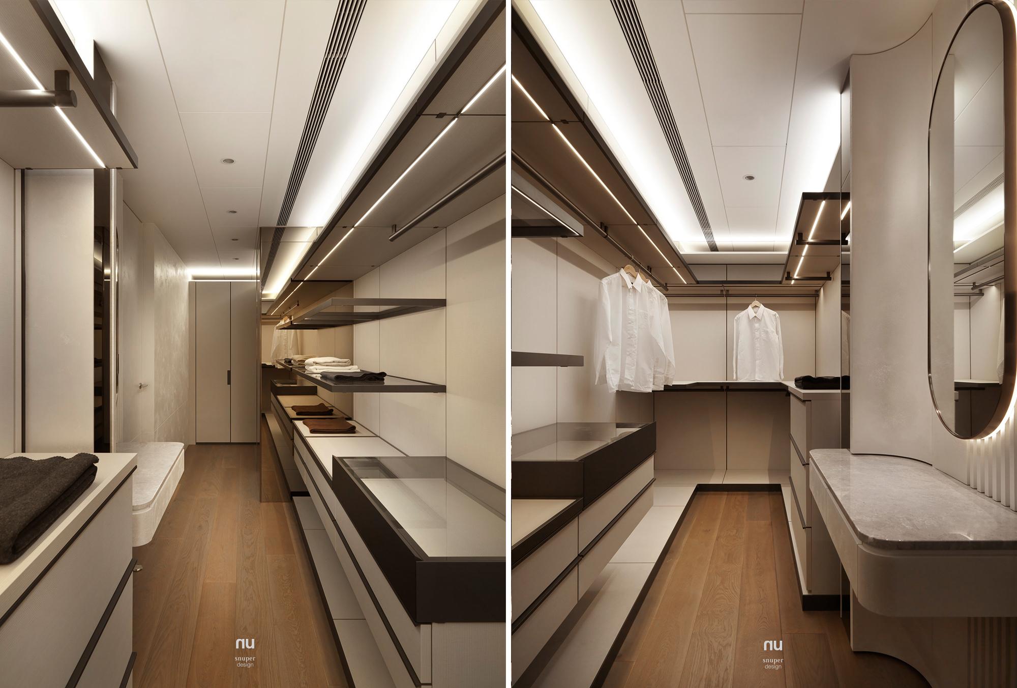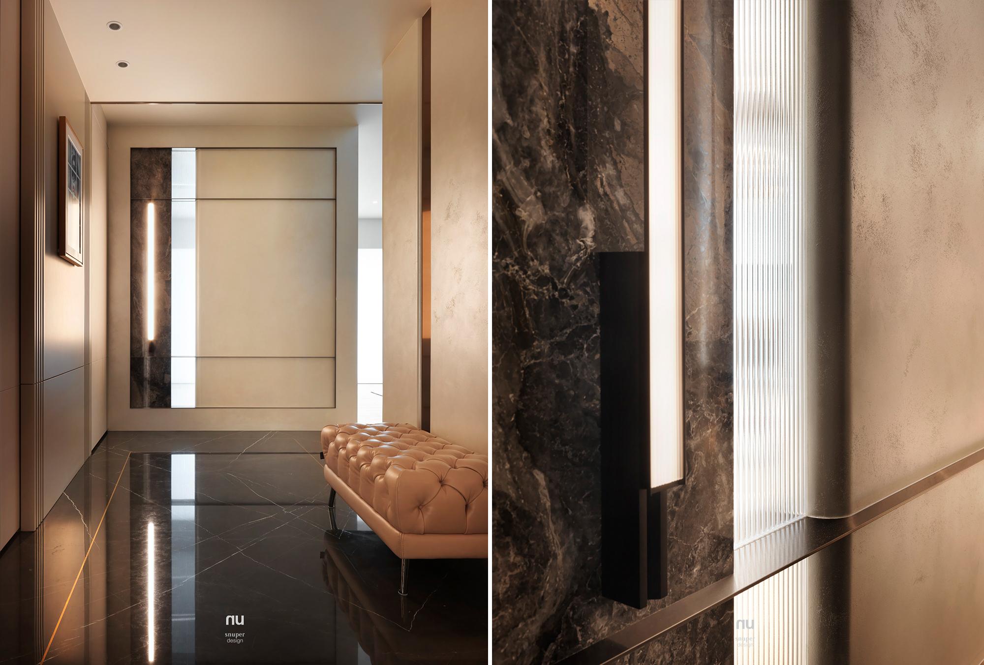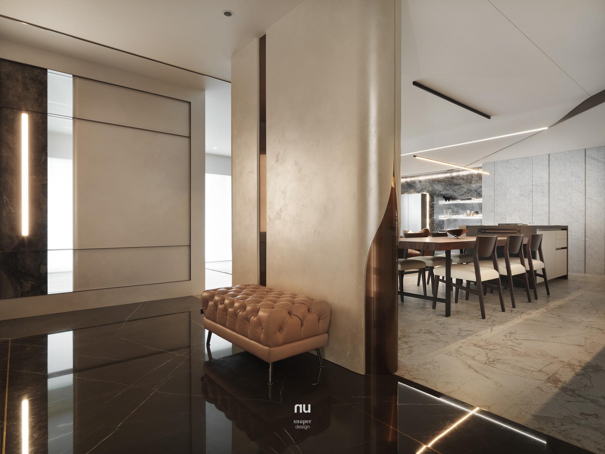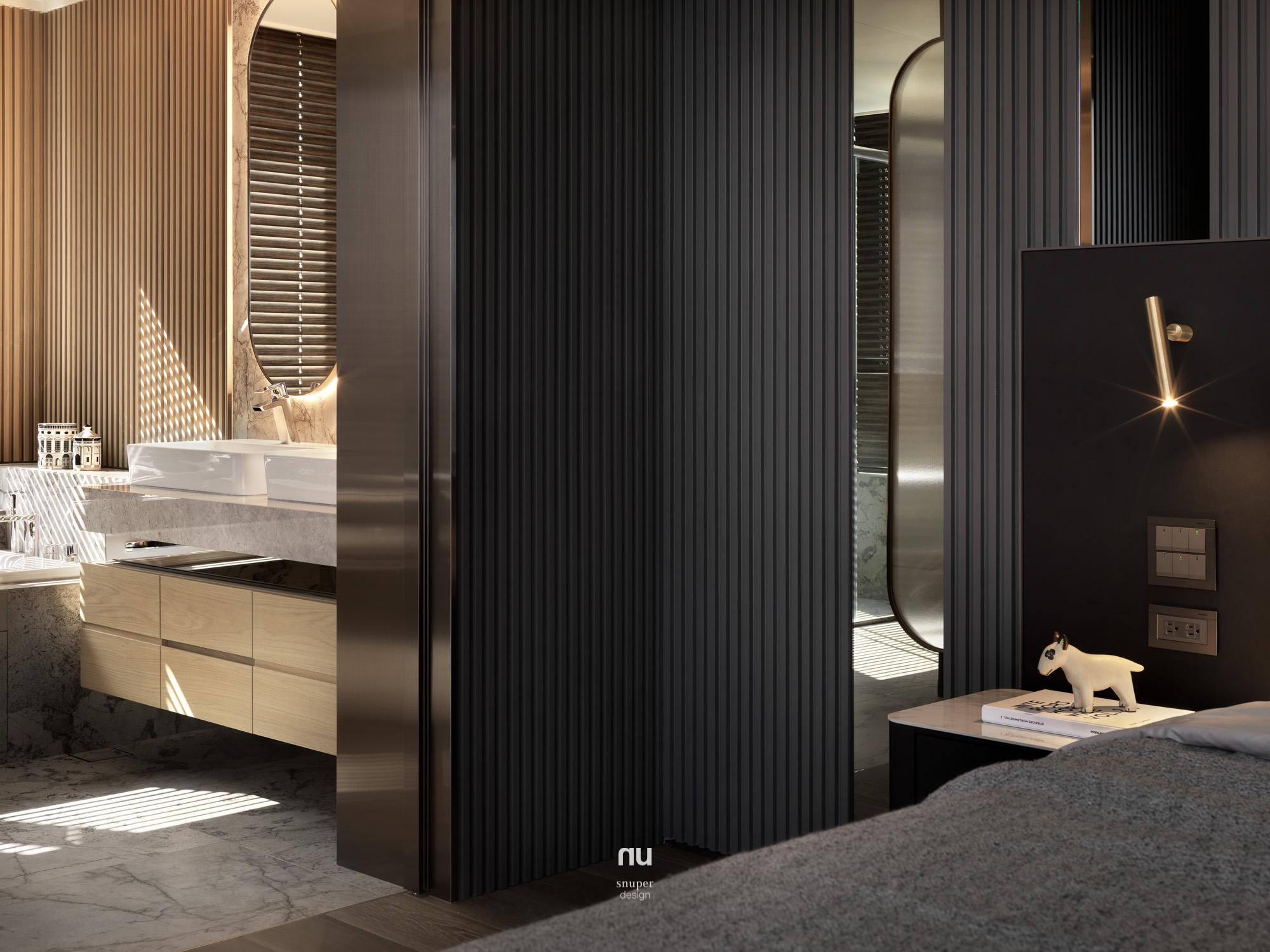 地坪以溫潤木質鋪陳公共區域基調,搭配大面石材牆與局部深色端景,形塑沉穩而內斂的空間層次;入口與轉折區則以高亮石材地坪界定迎賓儀式。立面透過格柵、線性語彙與金屬收邊統整視覺秩序,霧面牆質讓光線停留其上,低調而克制。客廳以深色石材主牆結合背光層次,銜接窗外城市輪廓與遠山景致,使景觀成為日常視野的一部分。動線由玄關的「由石入木」材質轉換展開,並以半透材質與圓角細節柔化公私邊界;衛浴與更衣空間則以整面石材、線性燈帶與鏡面整合,回應生活所需的機能與秩序。