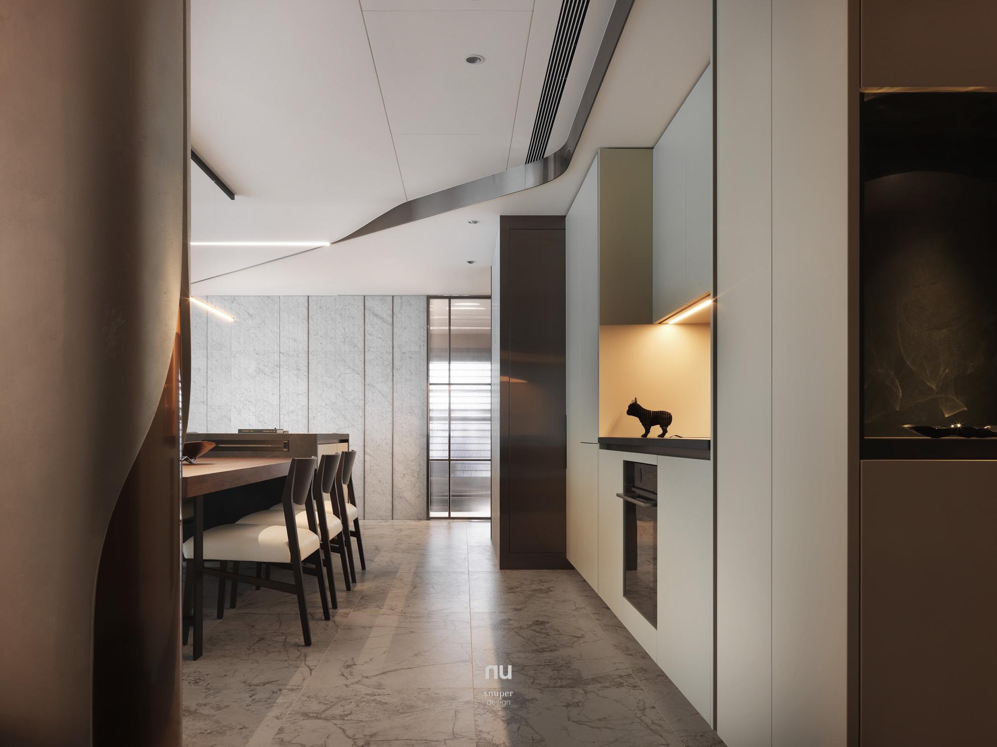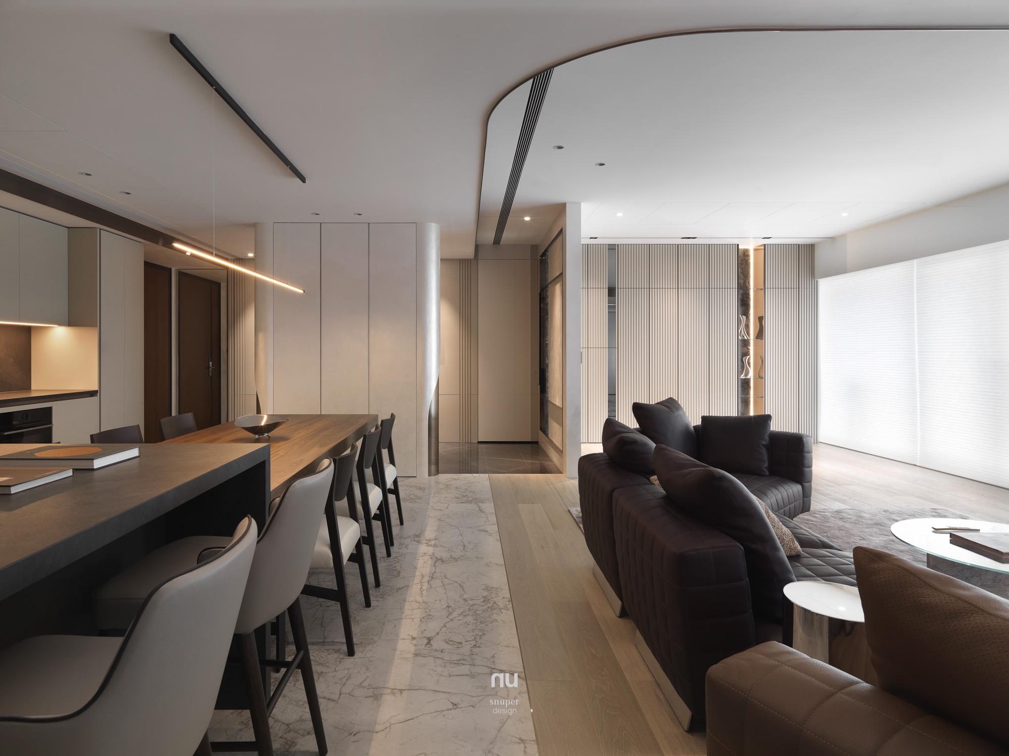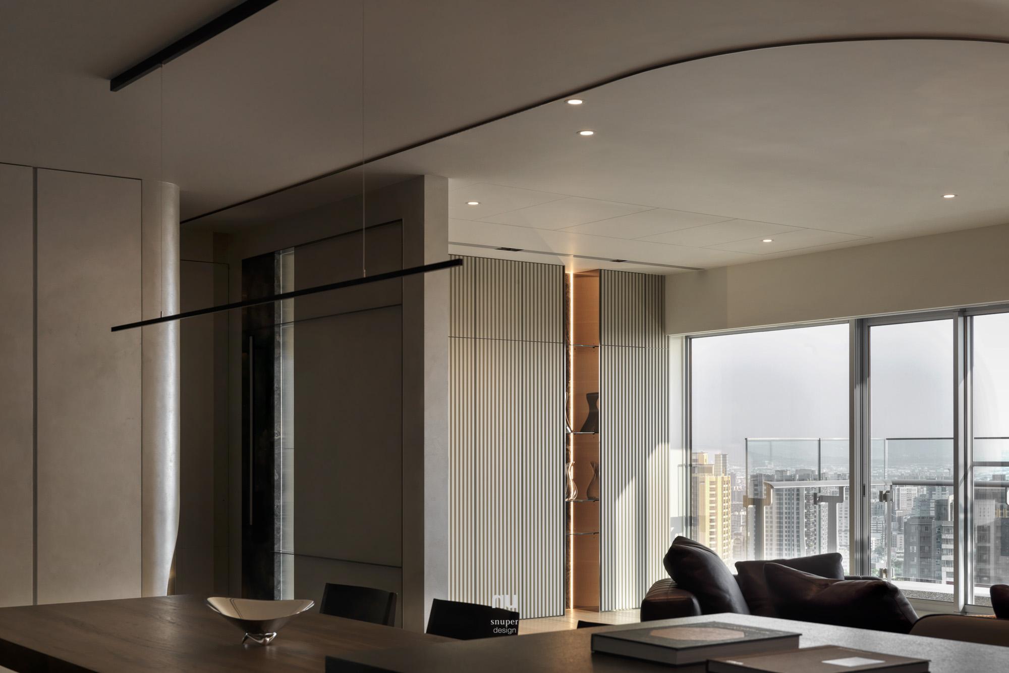 公領域以大面開窗與落地推拉門建立主要尺度,視線自客廳一路延伸至露台與城市天際線,形成明確的景觀端點。客餐廳與中島廚房採開放式整合,家具以低背、寬面量體配置,保留水平向的開闊感,使空間在視覺與使用上皆顯得從容。天花設計進行大幅整合,透過軸線轉折拉出連續弧線,修飾建築樑體並統整設備配置,同時以斜切方式延伸視線方向,讓客餐廳形成拋物線般的開闊動勢,在高度與水平向比例之間取得平衡,使公共區域的尺度、動線與視覺更加流暢。