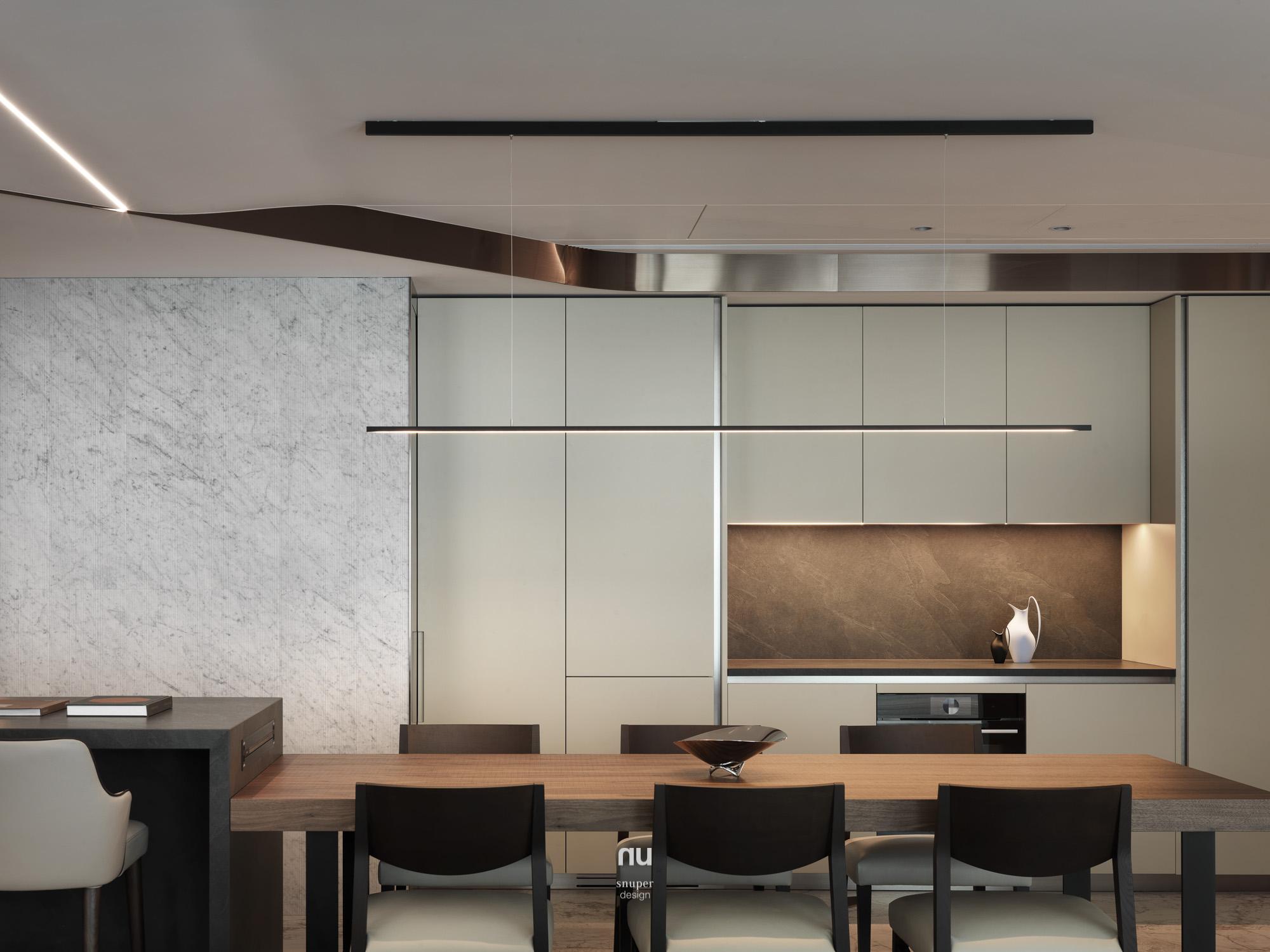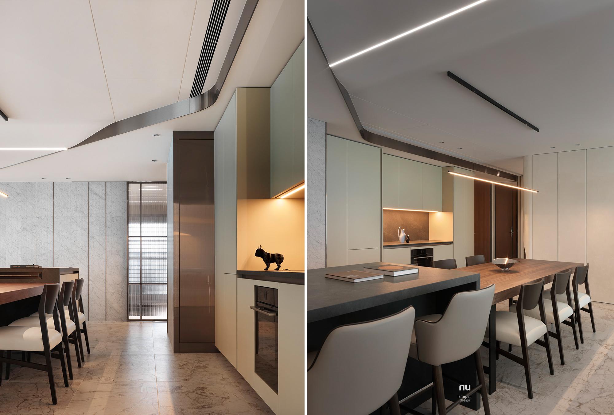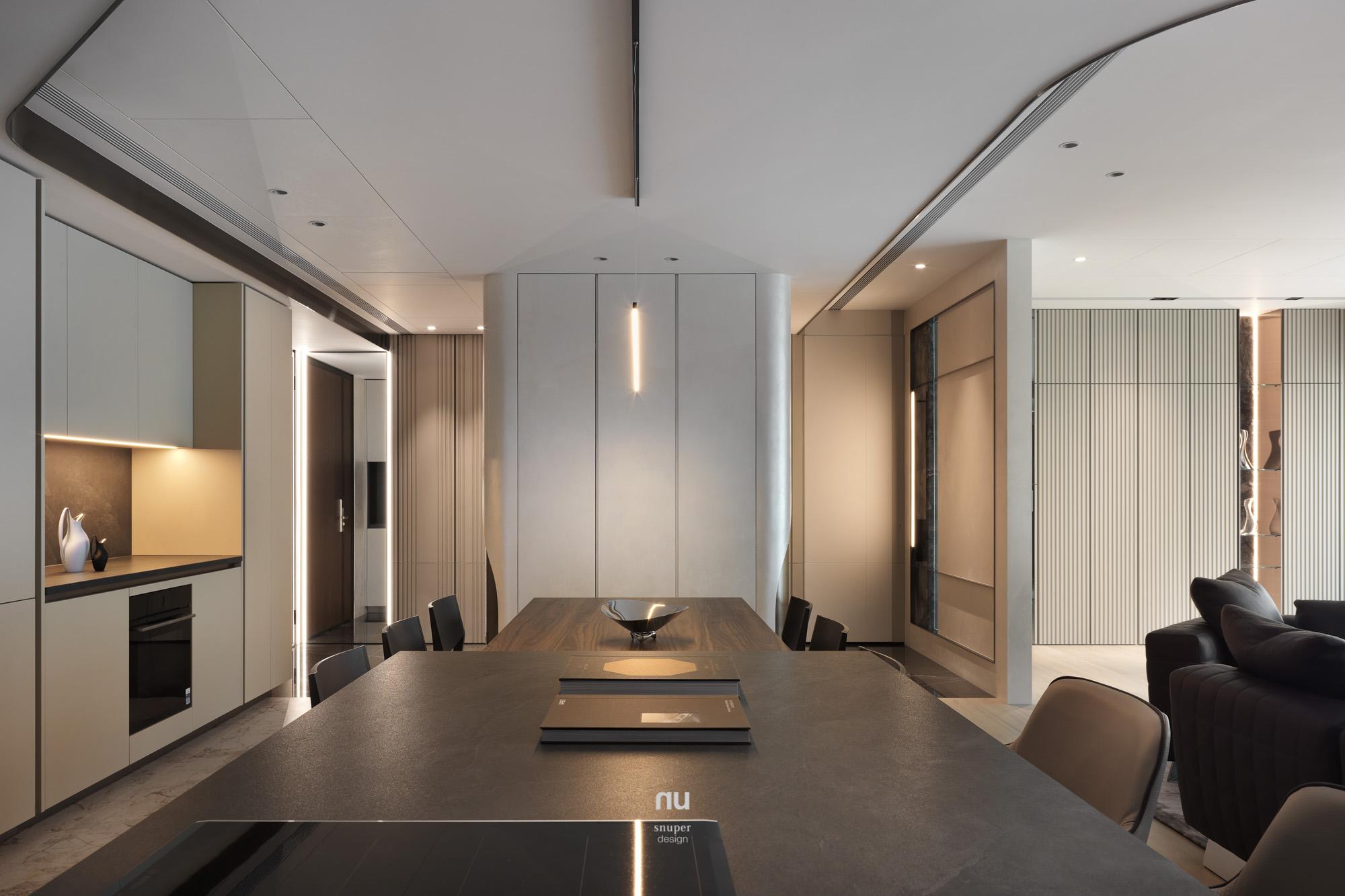 公領域以大面開窗與落地推拉門建立主要尺度,視線自客廳一路延伸至露台與城市天際線,形成明確的景觀端點。客餐廳與中島廚房採開放式整合,家具以低背、寬面量體配置,保留水平向的開闊感,使空間在視覺與使用上皆顯得從容。天花設計進行大幅整合,透過軸線轉折拉出連續弧線,修飾建築樑體並統整設備配置,同時以斜切方式延伸視線方向,讓客餐廳形成拋物線般的開闊動勢,在高度與水平向比例之間取得平衡,使公共區域的尺度、動線與視覺更加流暢。