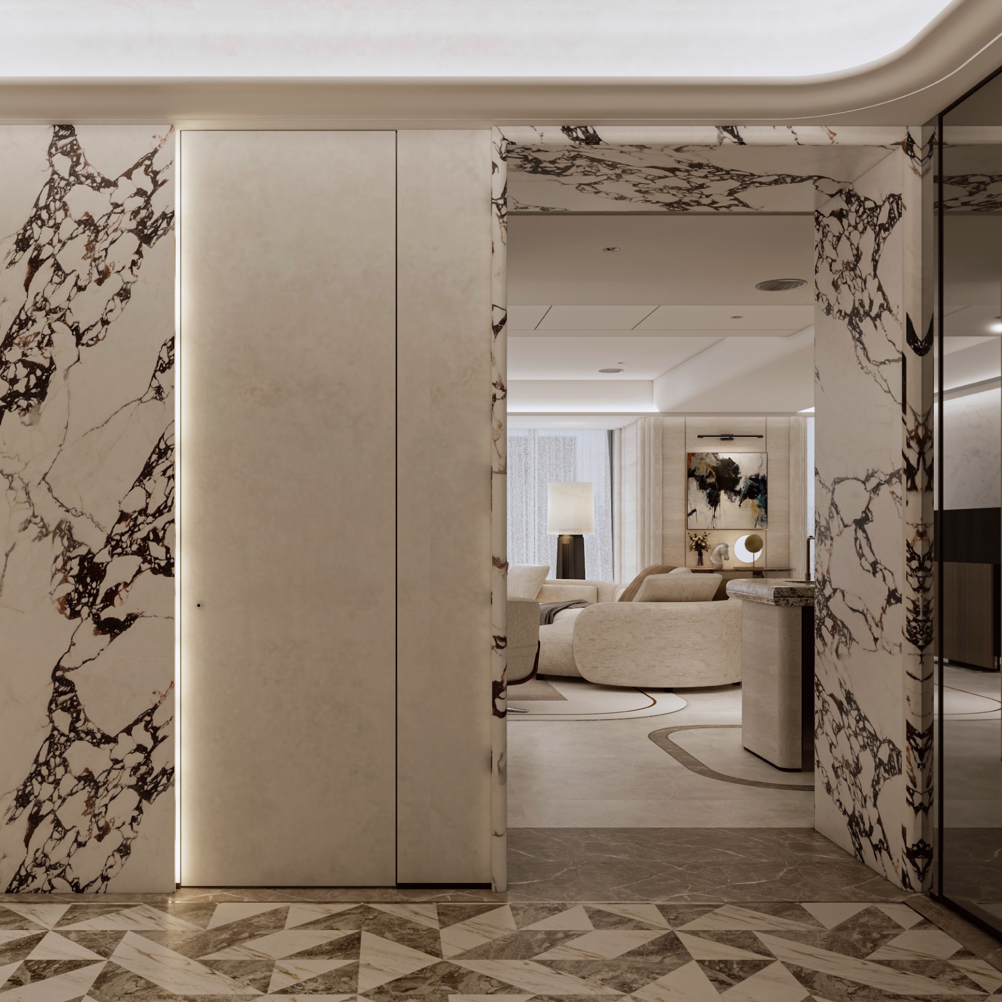 Harvest 以屋主收藏的藝術品作為設計開端,發散出屬於這個屋主的色彩。 藝術畫家 王仁傑 《心淨 新境》系列畫作,展現了中西並容的底蘊,融入自我對生命的觀照與記憶的軌跡,表達出濃烈的情感。而雕塑家廖述乾則帶出「兒時記趣」的童真與快樂,著實展現出屋主的心境狀態。 作品中以沉穩黑灰白為基調,搭配色彩飽滿的藝術品與現代傢俱單品,全開放式的格局安排,表達大器與開闊的胸襟,同時保有小孩房的彈性共享天倫之樂。主臥通透的環繞式動線,則為屋主規劃完整的私領域空間,生活之間,表達外在的歡樂、內在的寧靜。