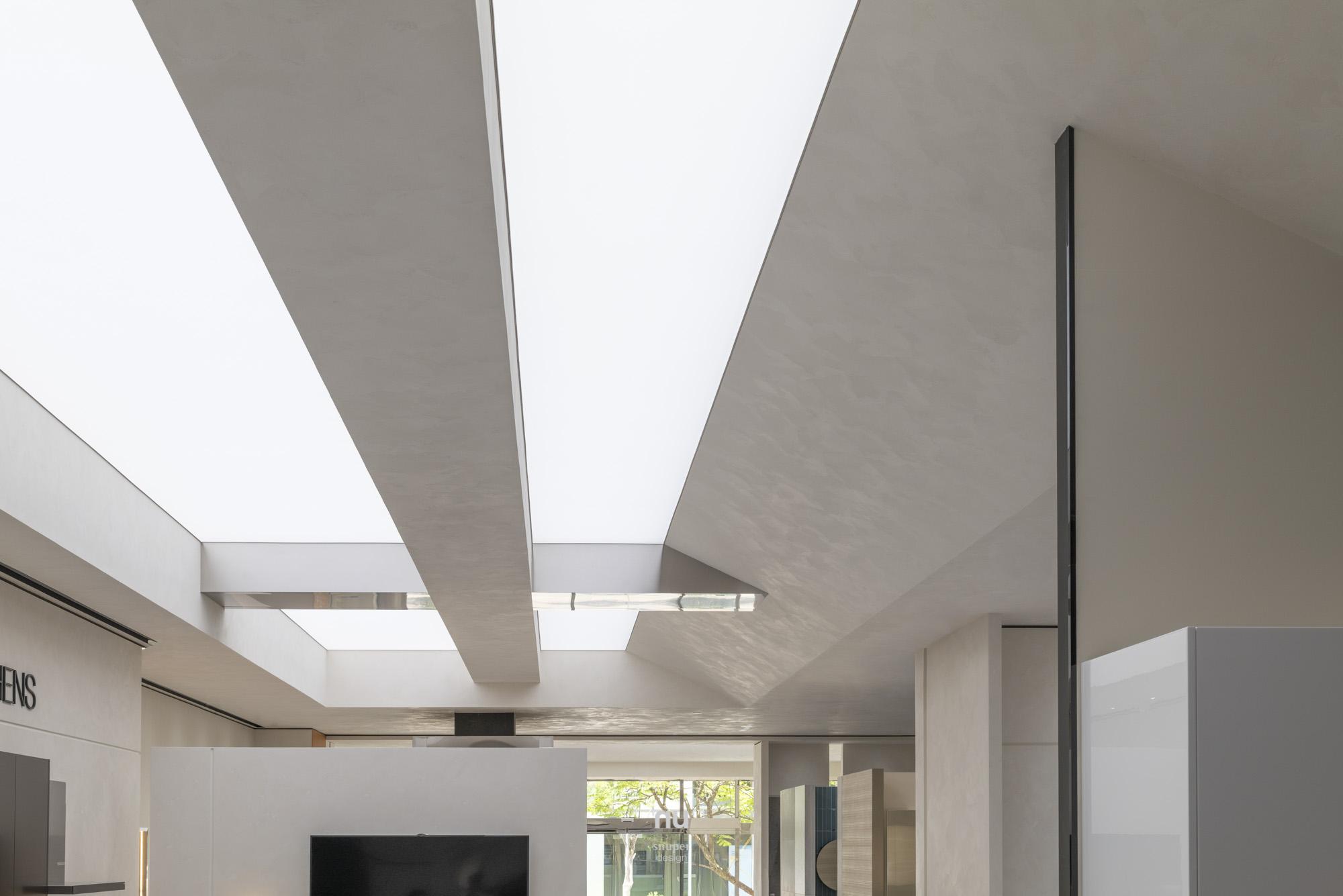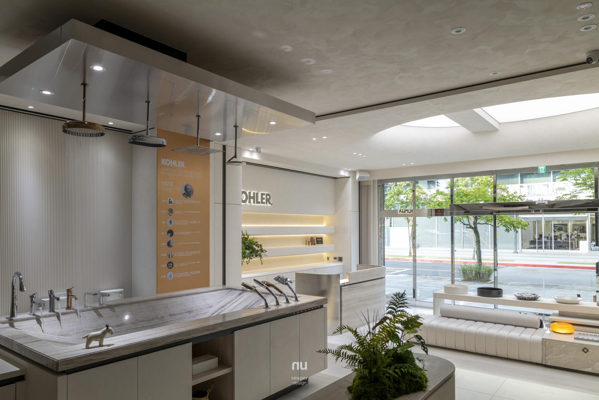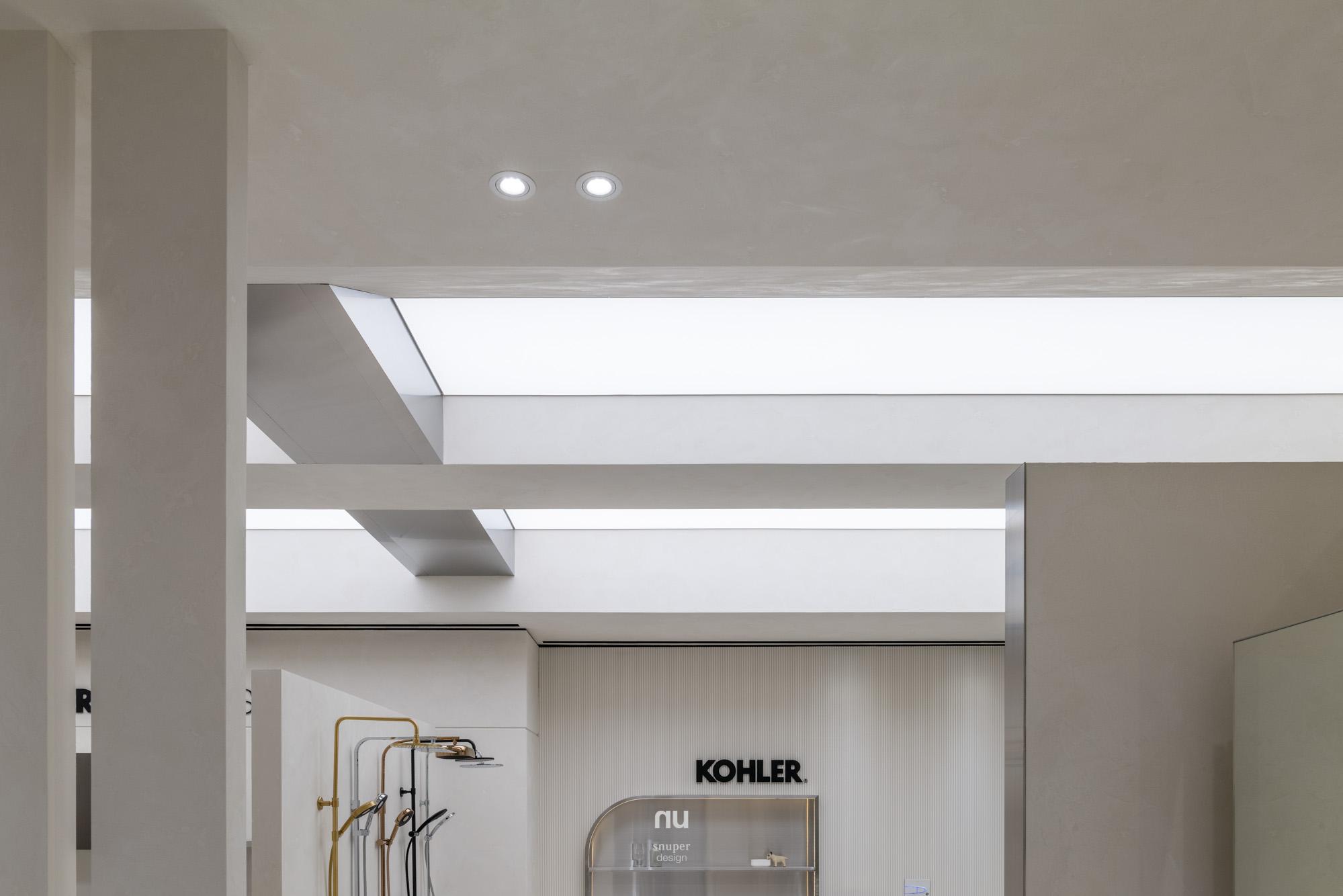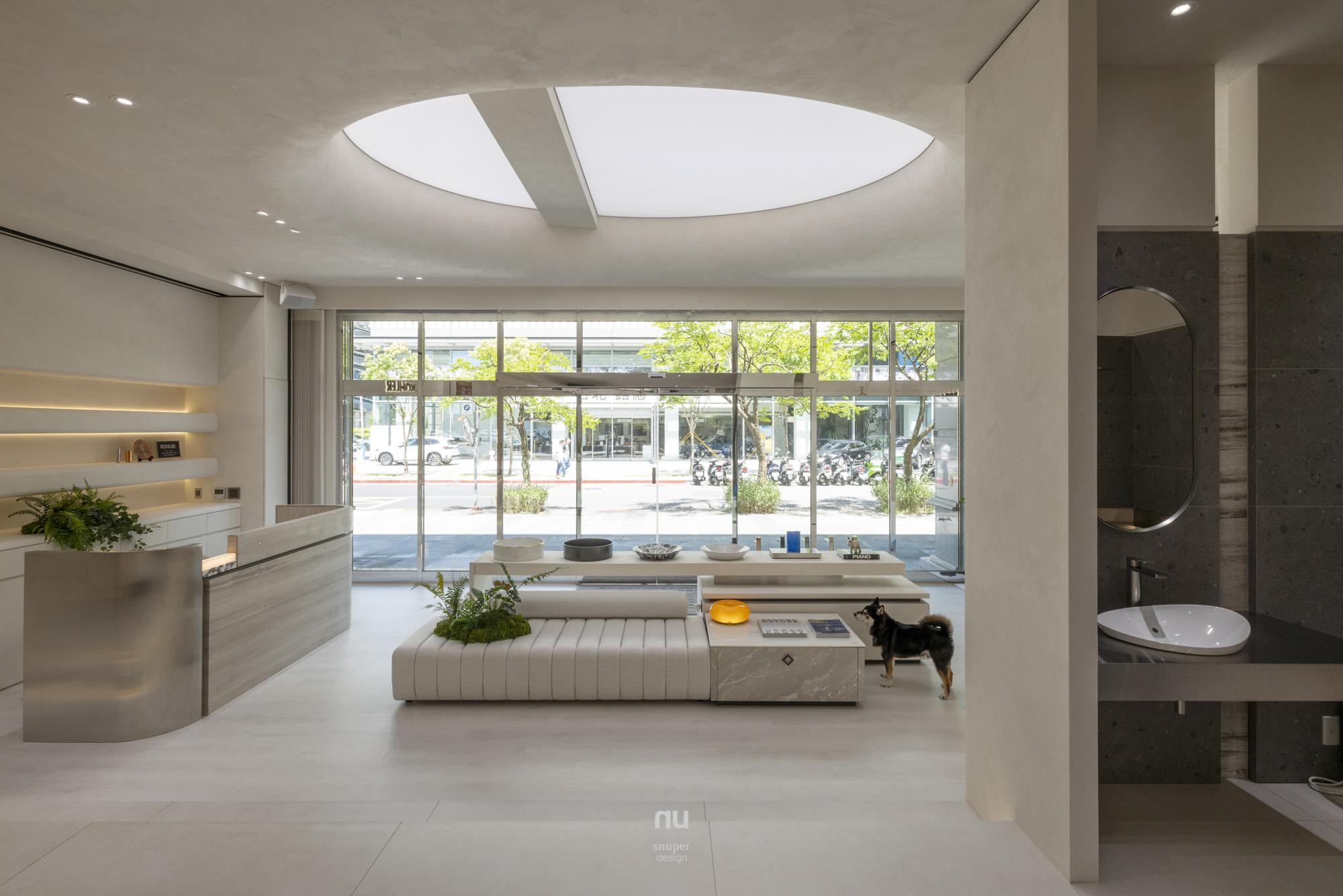在這裡產品不再停留於陳列之中,而是在貼近日常的情境裡被自然理解。展間的角色,也因此有了更細膩的詮釋。以低彩度為基底,運用塗料、深淺飾面、人造石、木質紋理與金屬元素,以及光膜與造型板等語彙,建立安靜而細緻的層次。天花中的圓形開口與線性光帶形成主要節奏,光線在不同區域之間緩慢轉換,空間感受亦隨之連續展開。