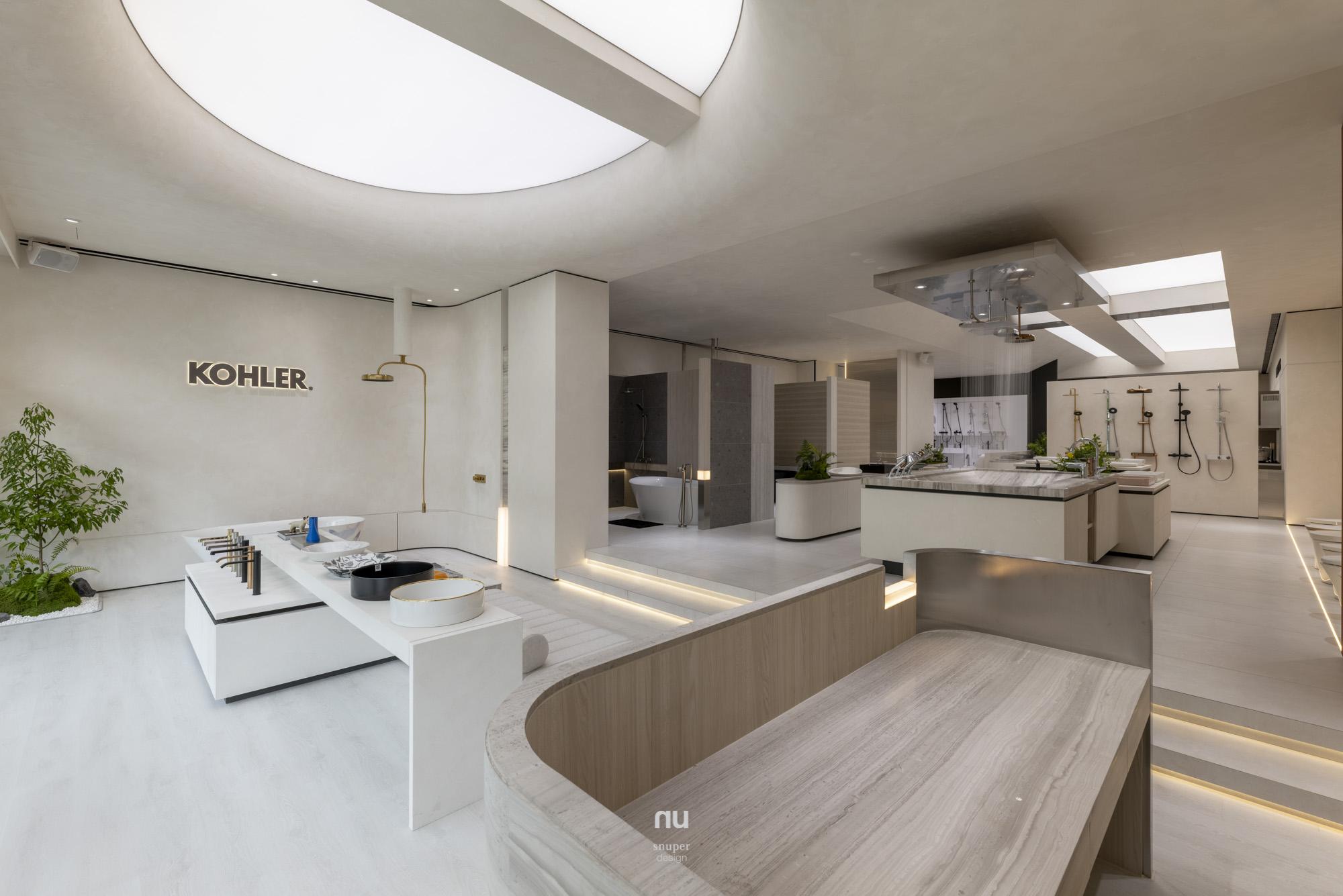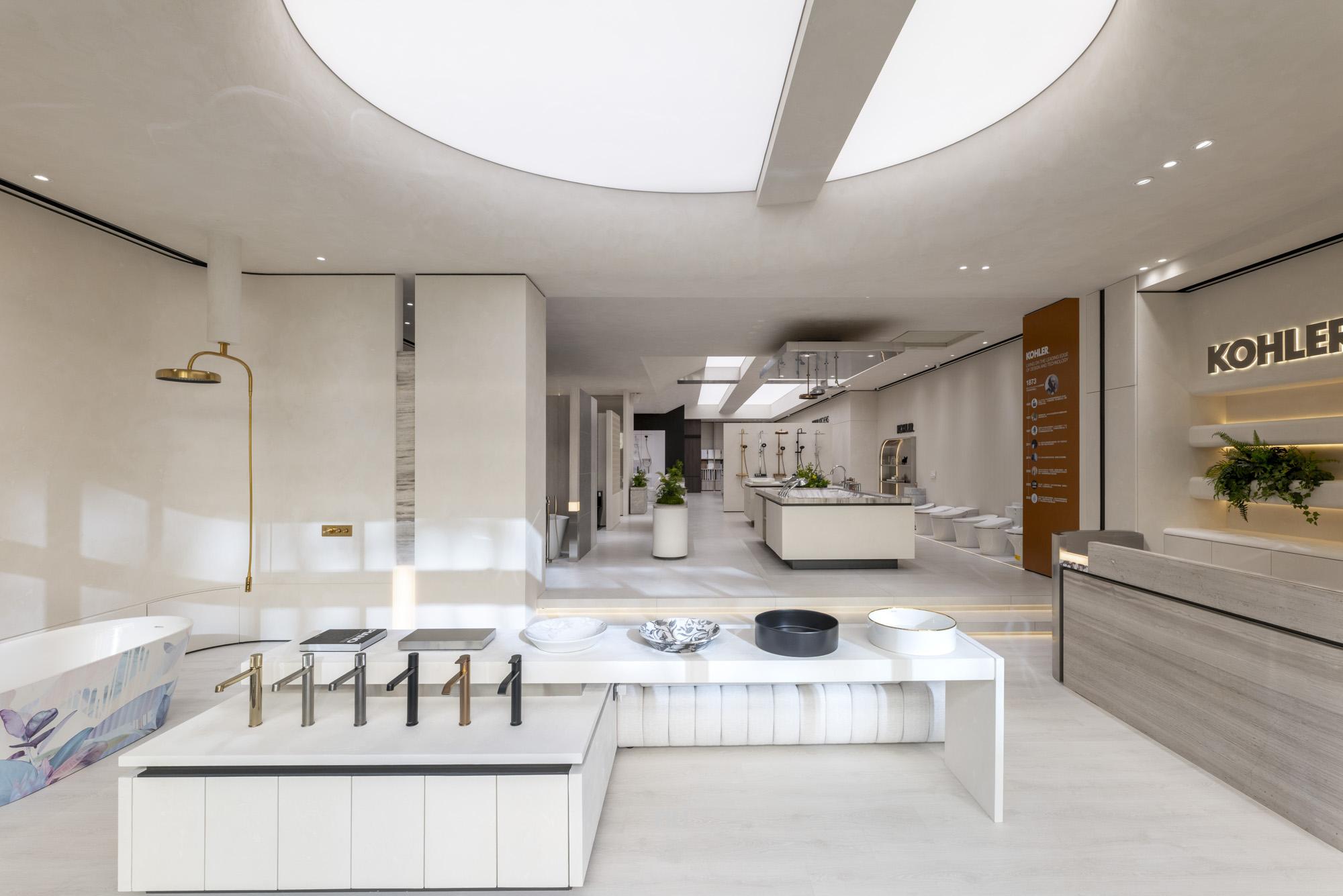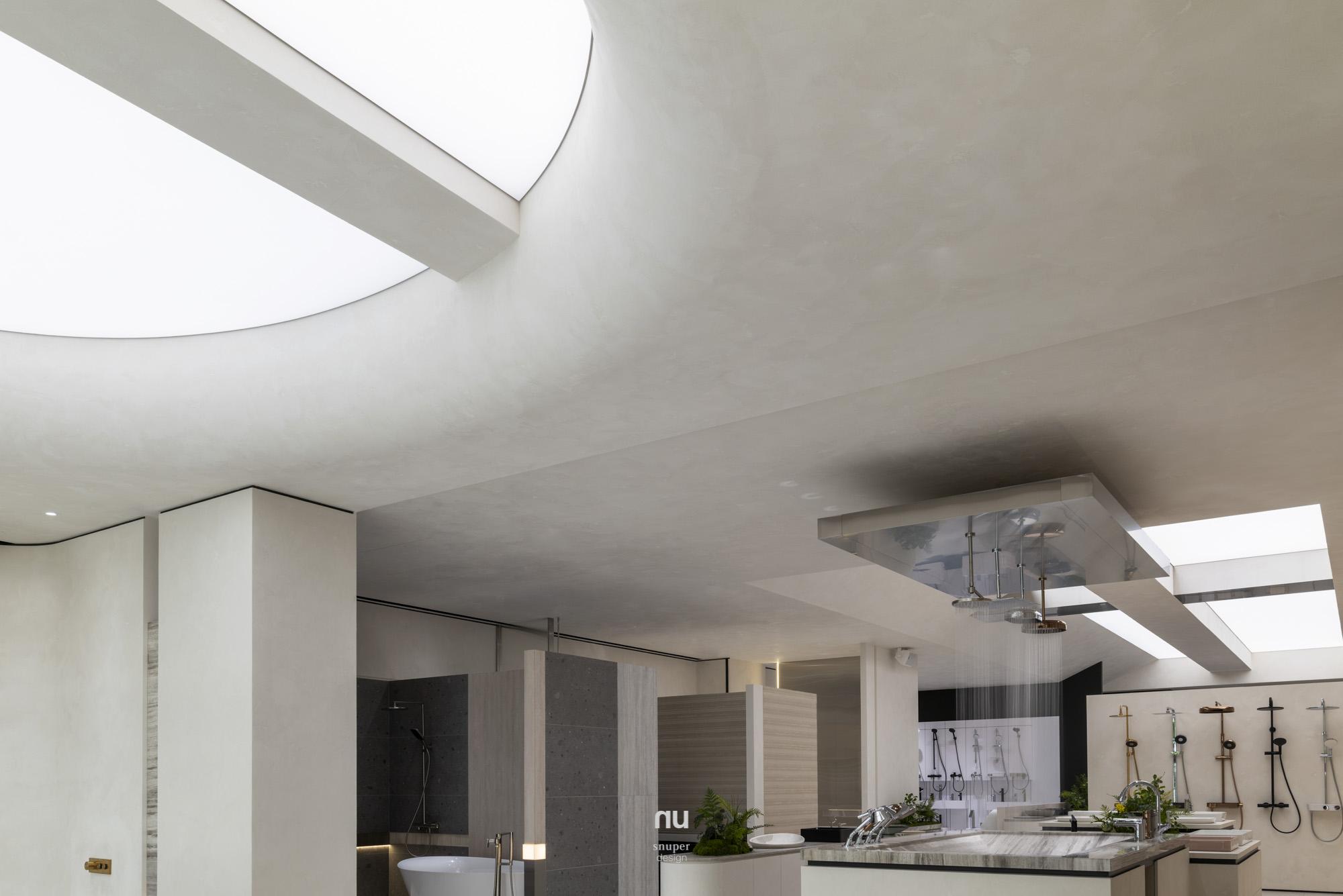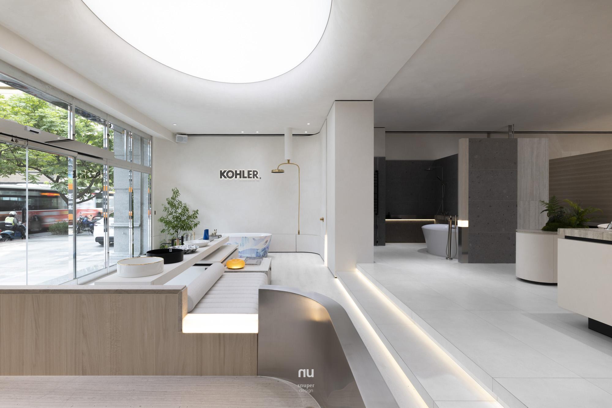 在這裡產品不再停留於陳列之中,而是在貼近日常的情境裡被自然理解。展間的角色,也因此有了更細膩的詮釋。以低彩度為基底,運用塗料、深淺飾面、人造石、木質紋理與金屬元素,以及光膜與造型板等語彙,建立安靜而細緻的層次。天花中的圓形開口與線性光帶形成主要節奏,光線在不同區域之間緩慢轉換,空間感受亦隨之連續展開。