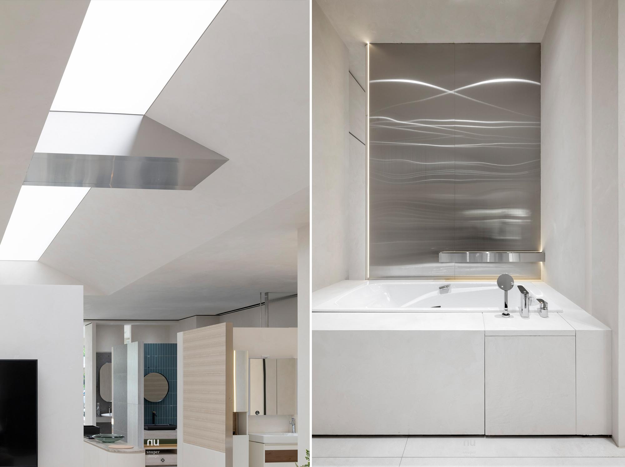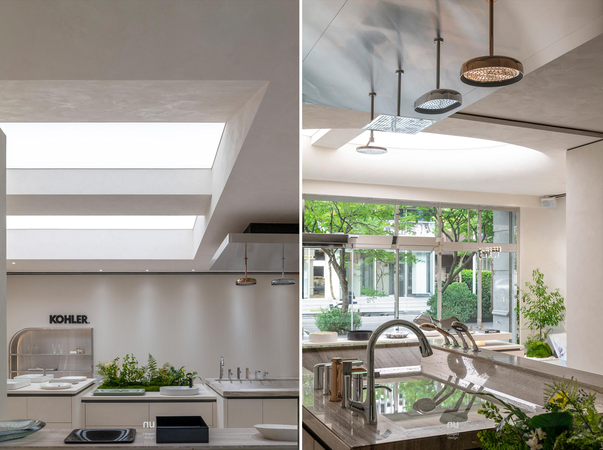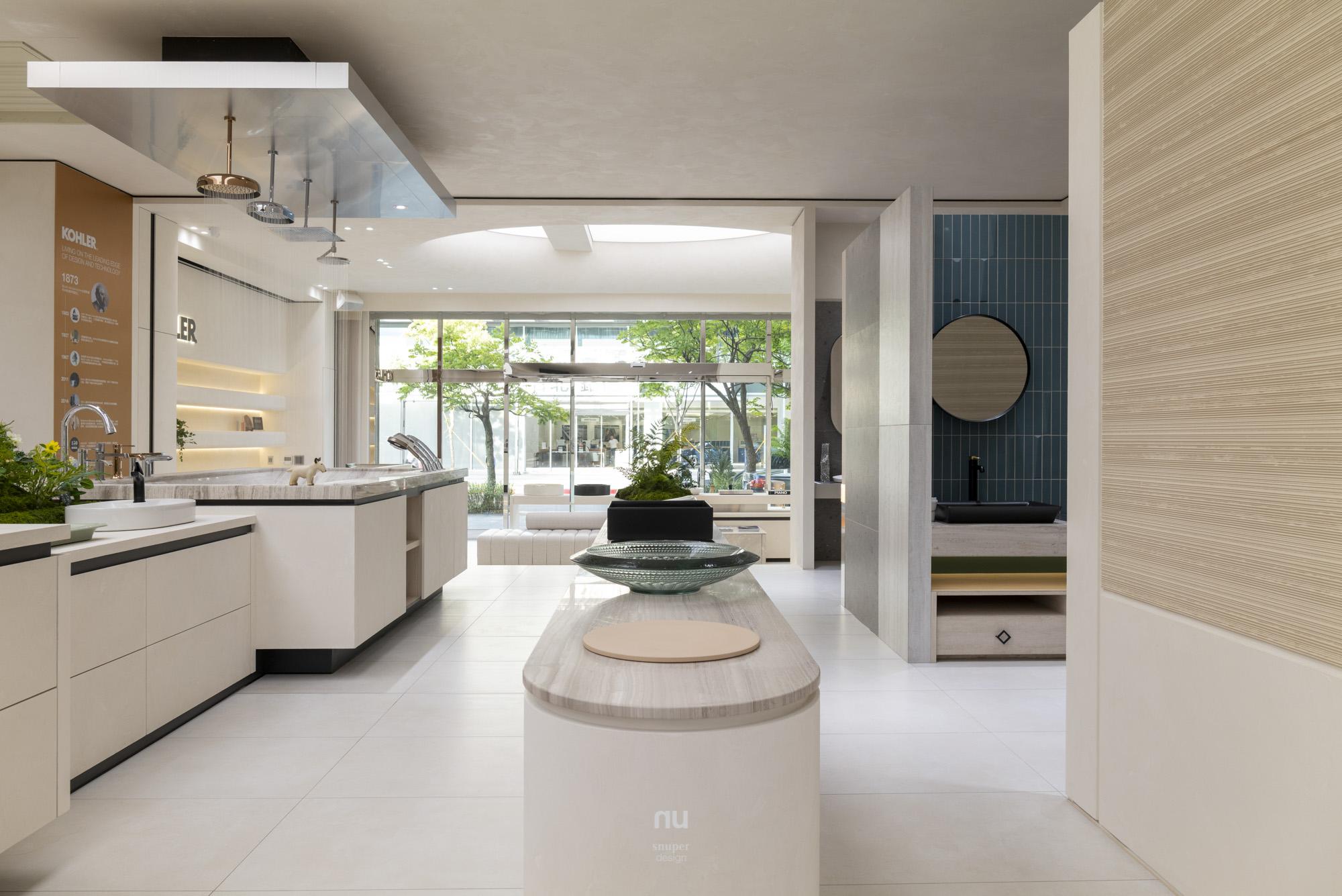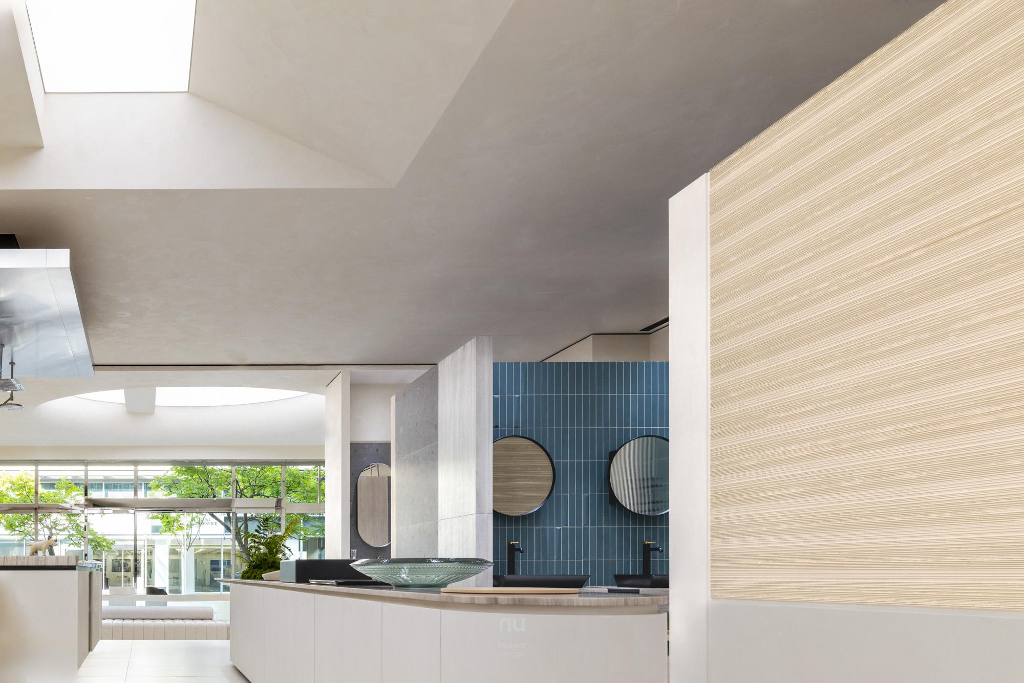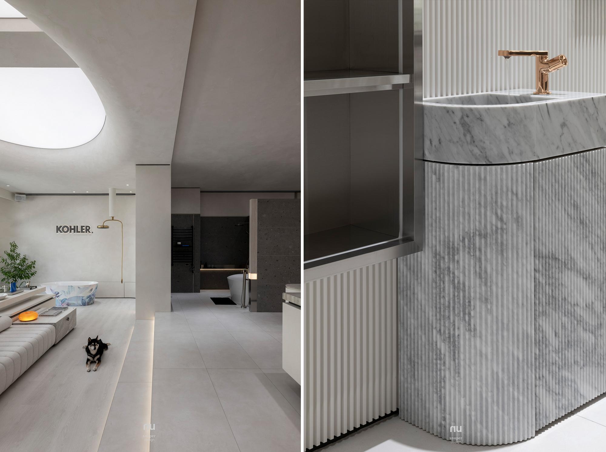 在這裡產品不再停留於陳列之中,而是在貼近日常的情境裡被自然理解。展間的角色,也因此有了更細膩的詮釋。以低彩度為基底,運用塗料、深淺飾面、人造石、木質紋理與金屬元素,以及光膜與造型板等語彙,建立安靜而細緻的層次。天花中的圓形開口與線性光帶形成主要節奏,光線在不同區域之間緩慢轉換,空間感受亦隨之連續展開。