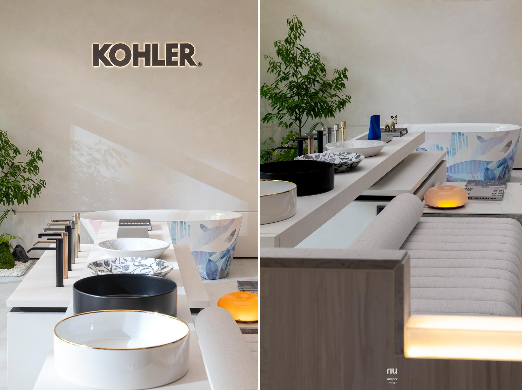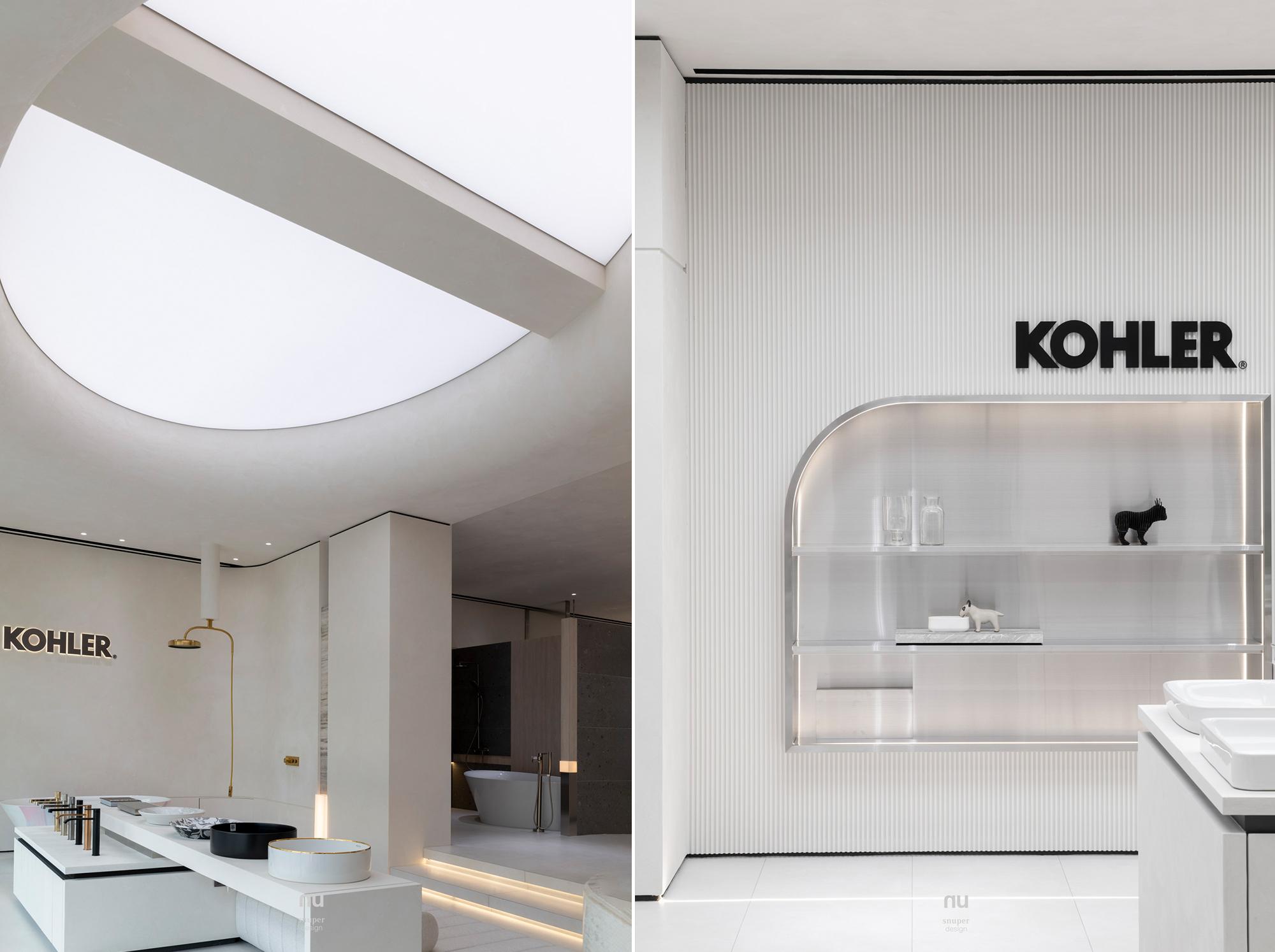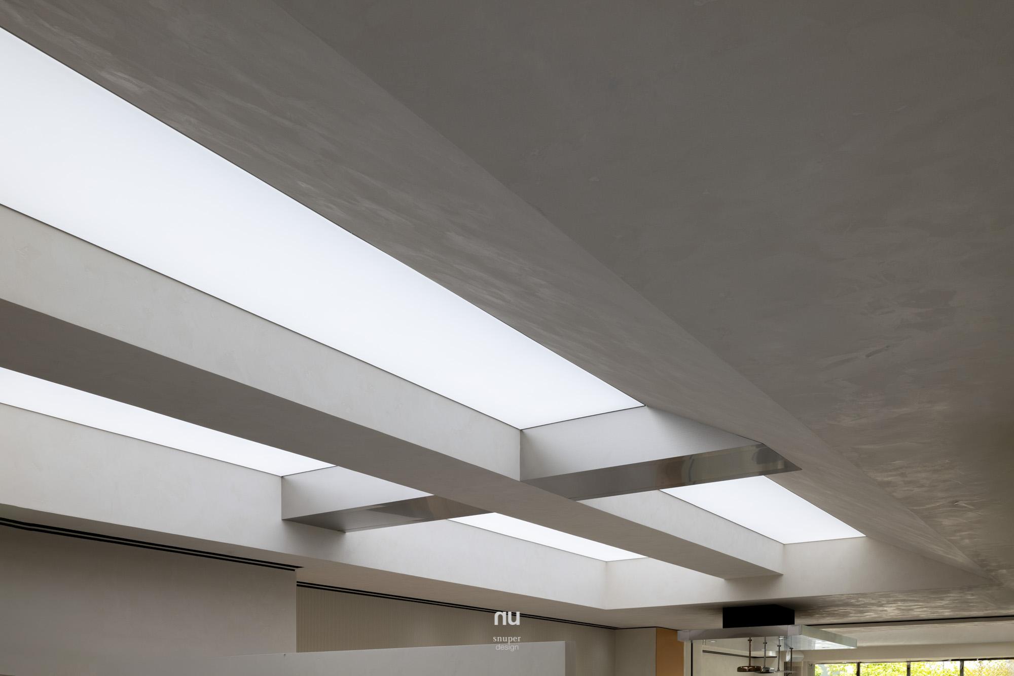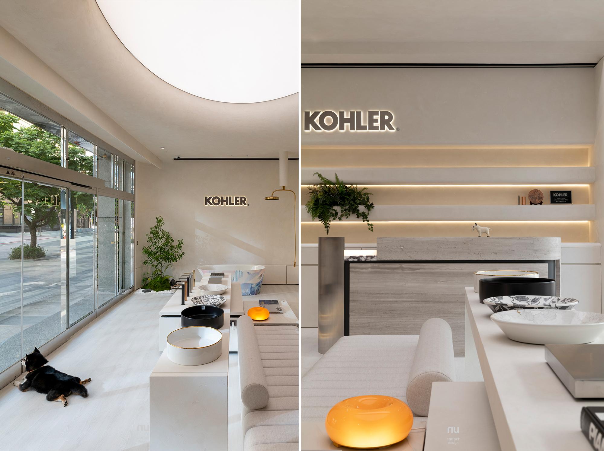在這裡產品不再停留於陳列之中,而是在貼近日常的情境裡被自然理解。展間的角色,也因此有了更細膩的詮釋。以低彩度為基底,運用塗料、深淺飾面、人造石、木質紋理與金屬元素,以及光膜與造型板等語彙,建立安靜而細緻的層次。天花中的圓形開口與線性光帶形成主要節奏,光線在不同區域之間緩慢轉換,空間感受亦隨之連續展開。