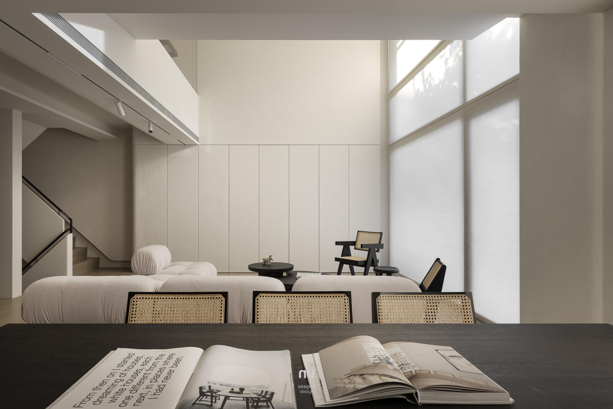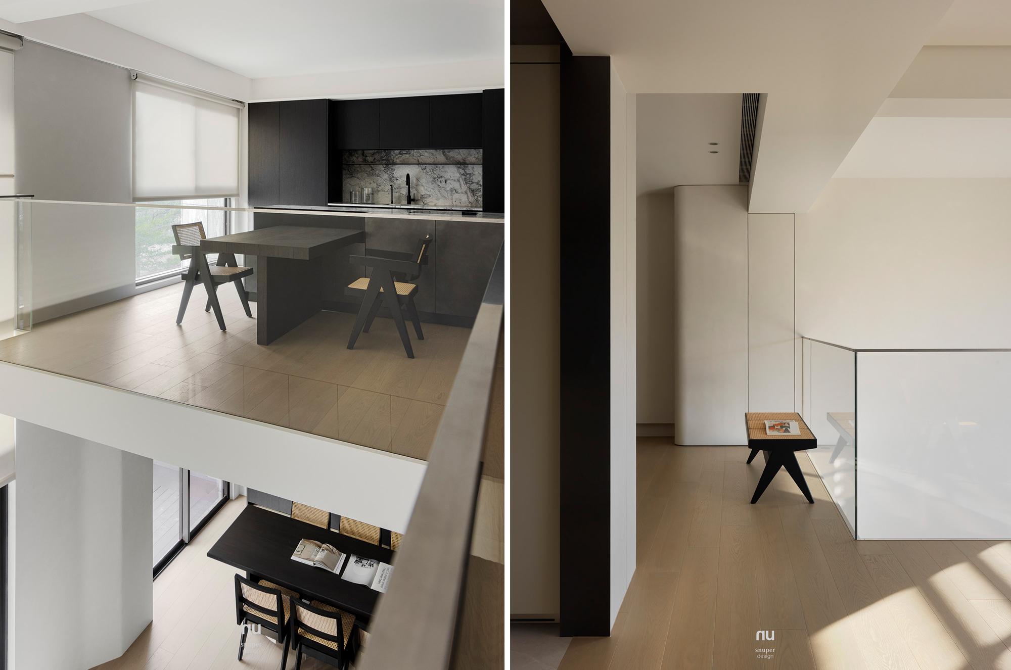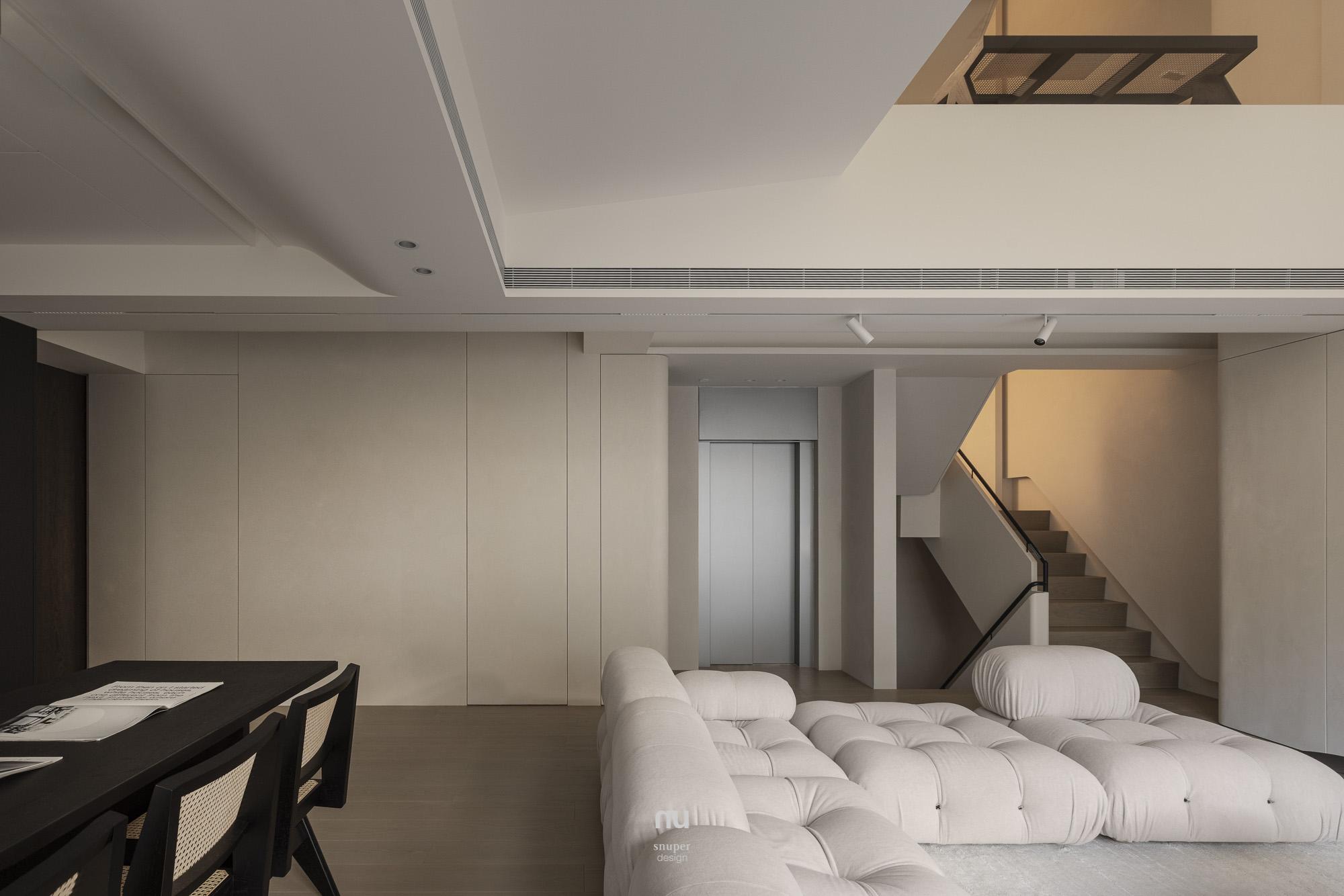 本案以複層與挑空打開住宅的垂直尺度,生活不再停留於單一平面。上下之間保有通透的視線關係,各自成立,也彼此回應,使空間在流動之中仍維持清楚而安定的界線。