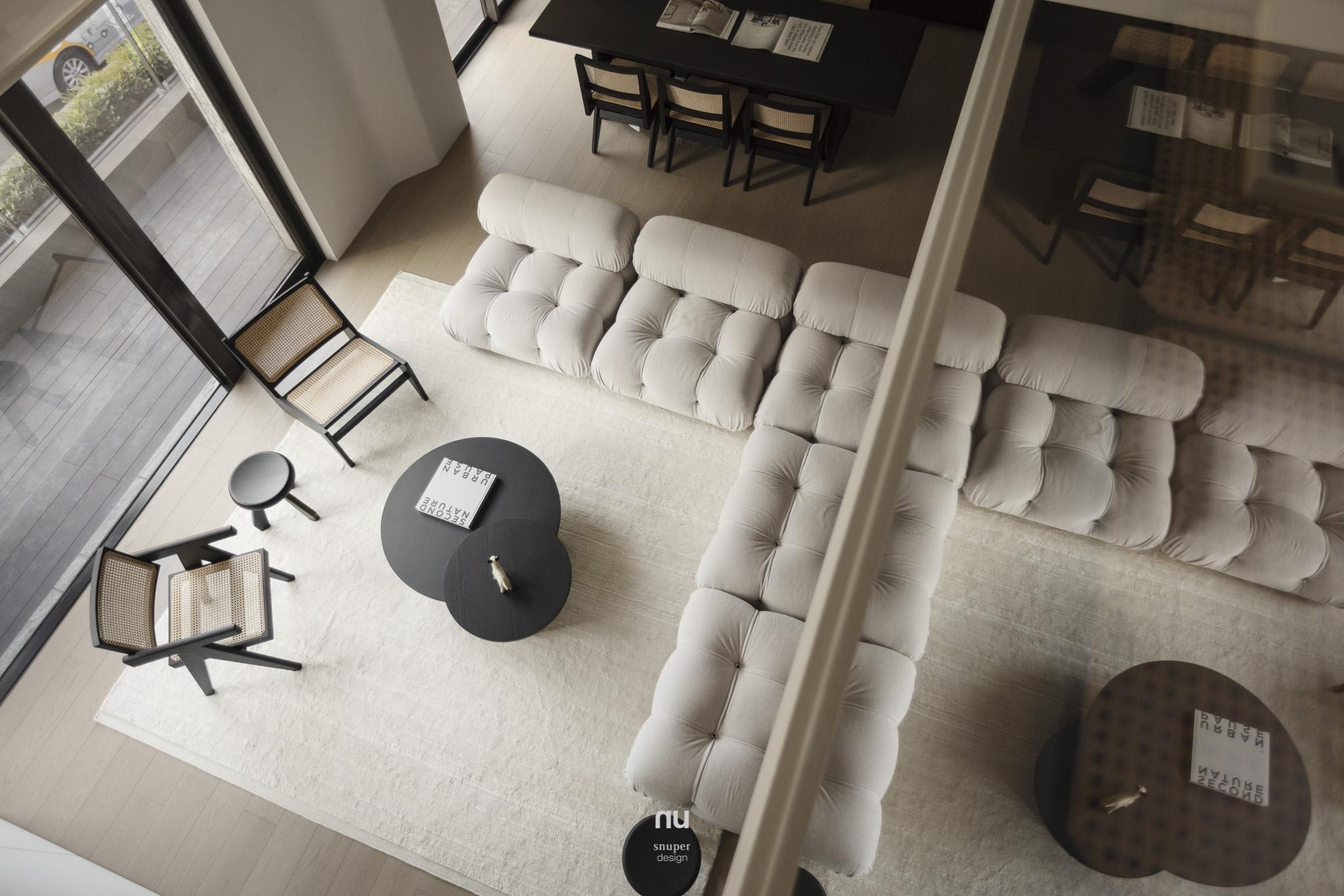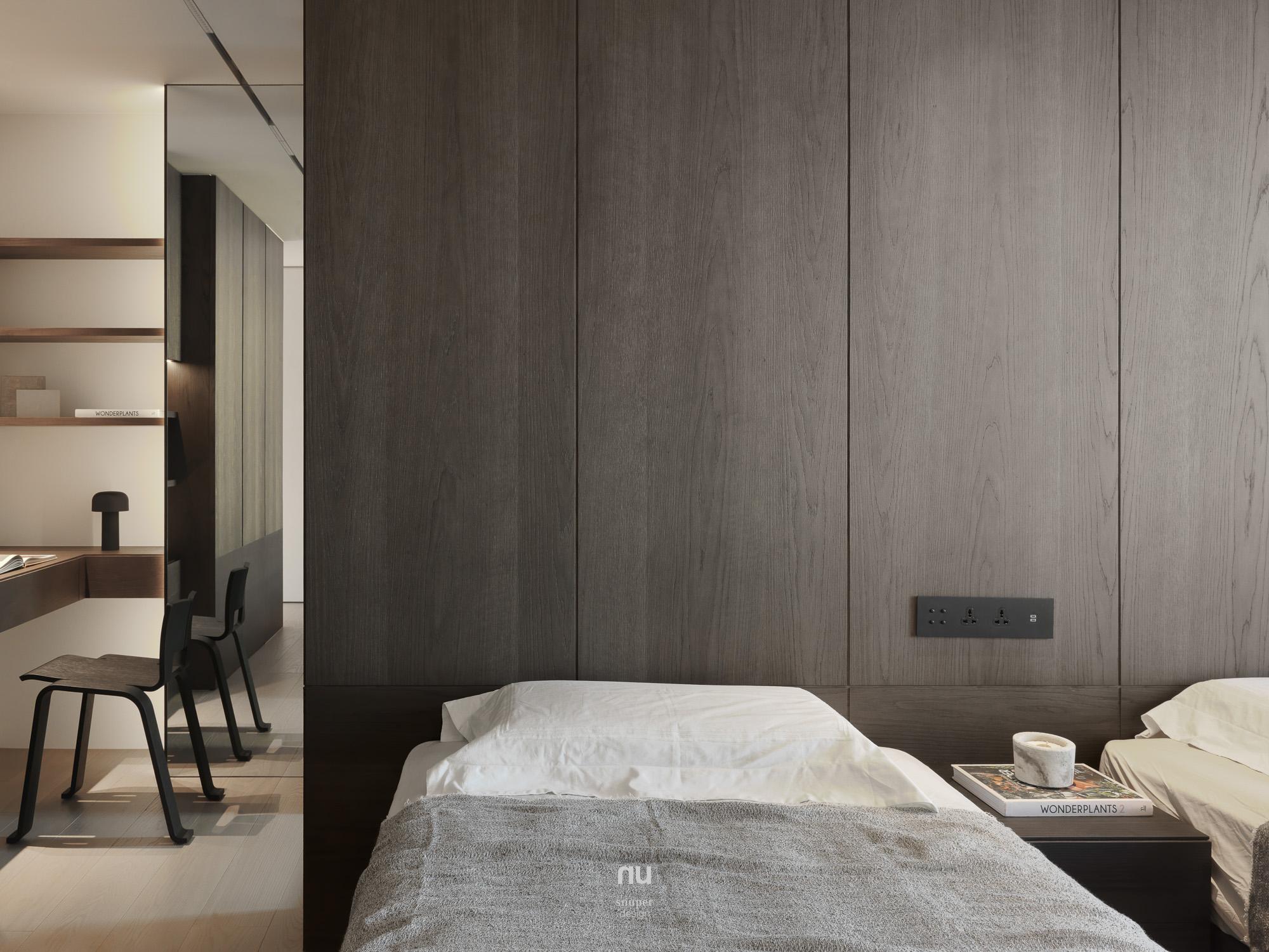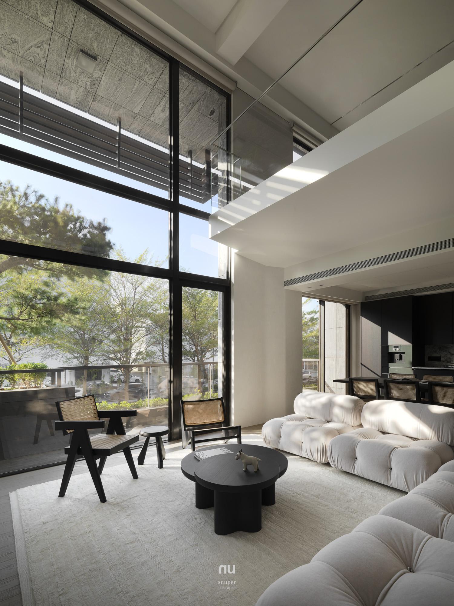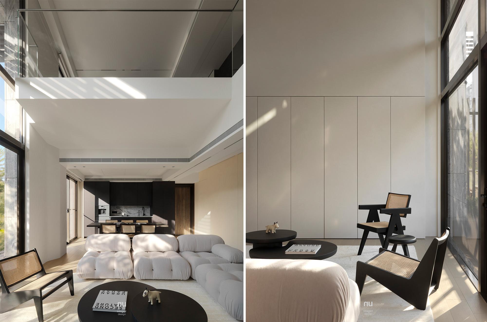 家具視覺重心適度下移,使挑空尺度更為清晰;深淺材質交錯,讓公共場域保有開放感,也維持穩定秩序。私領域則進一步收攏情緒,將休息留給光與更純粹的空間本質。
