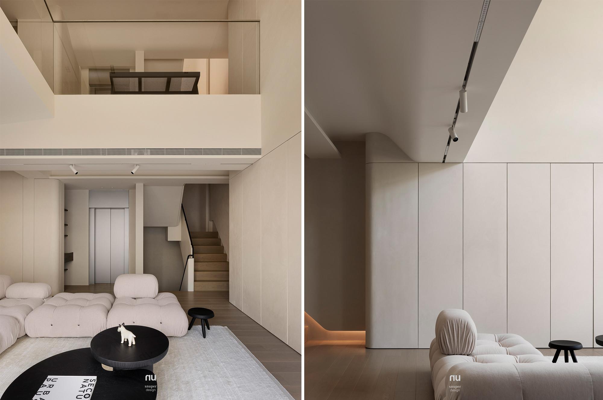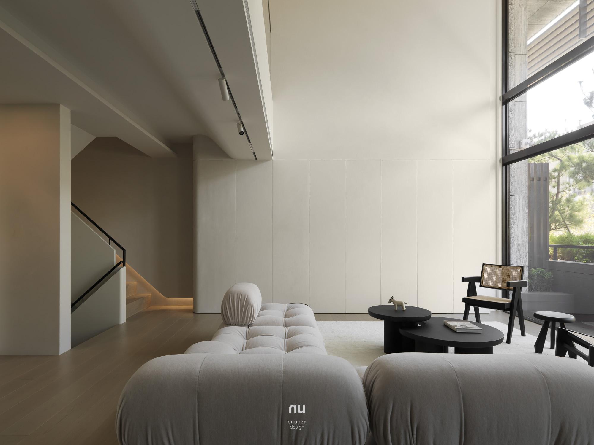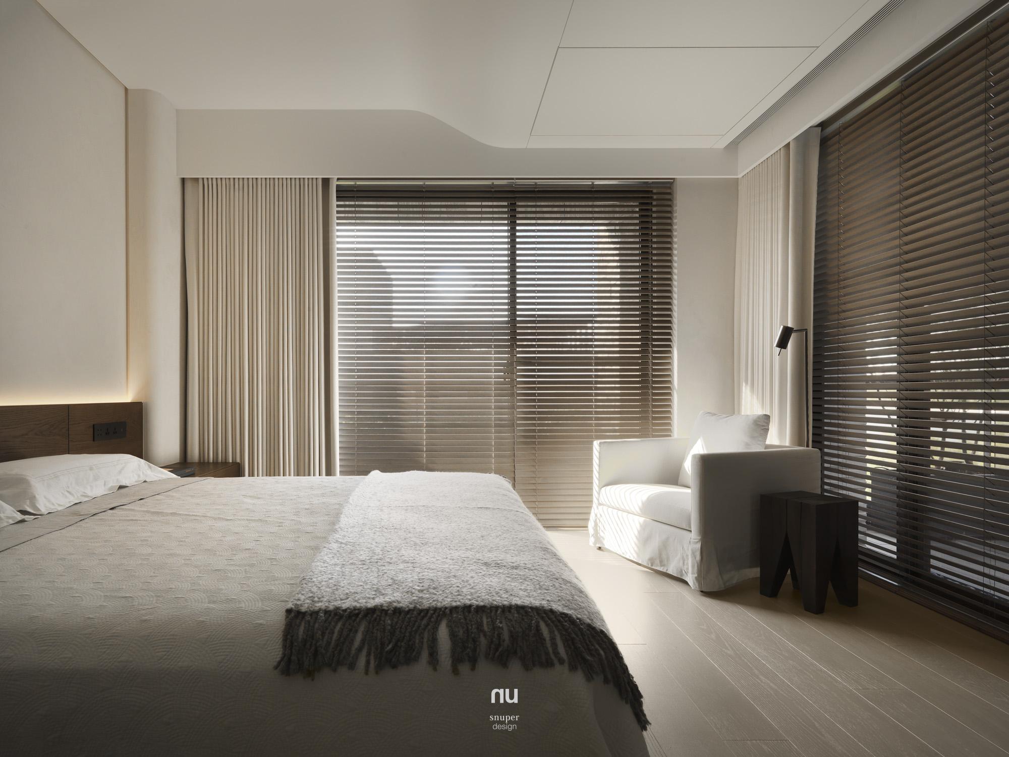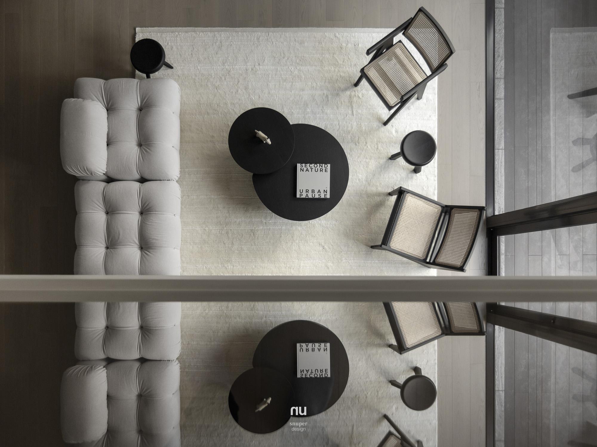 家具視覺重心適度下移,使挑空尺度更為清晰;深淺材質交錯,讓公共場域保有開放感,也維持穩定秩序。私領域則進一步收攏情緒,將休息留給光與更純粹的空間本質。