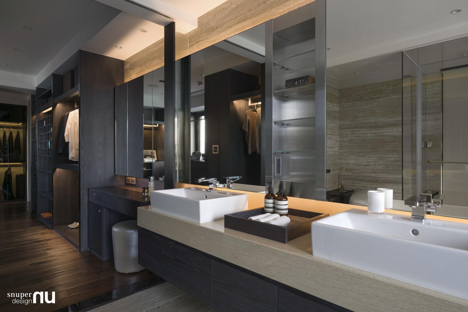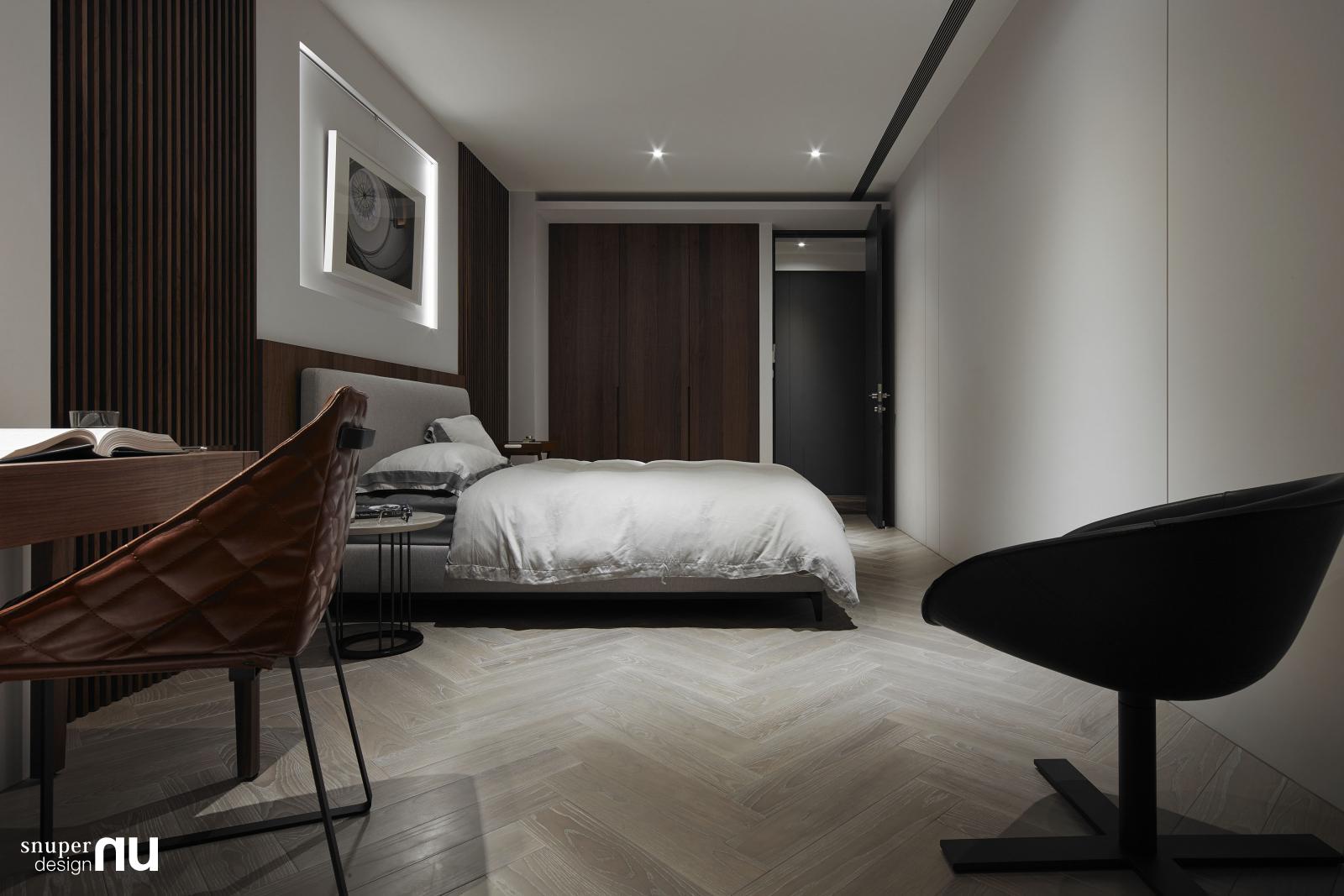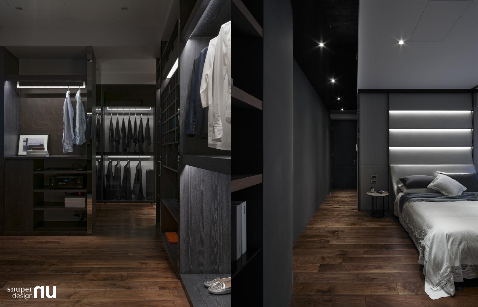 轉折進入私領域後,設計師林政緯以「飯店式」的套房規格為基準,讓私領域各自機能完善,讓使用者可身在其中放鬆心緒、自然深呼吸。 以飯店式內玄關的效果為靈感,刻意將門扇內縮,做為場域轉換的中介。主臥室規劃為整套舒適套房,以灰黑色調為基底,將主人內斂具有個性化的特徵表露無遺,其中安排更衣室作為臥房與衛浴的區隔,悉心規畫收納、梳妝、瑜珈運動等空間,讓此處成為屋主私密空間中的另一軸心。